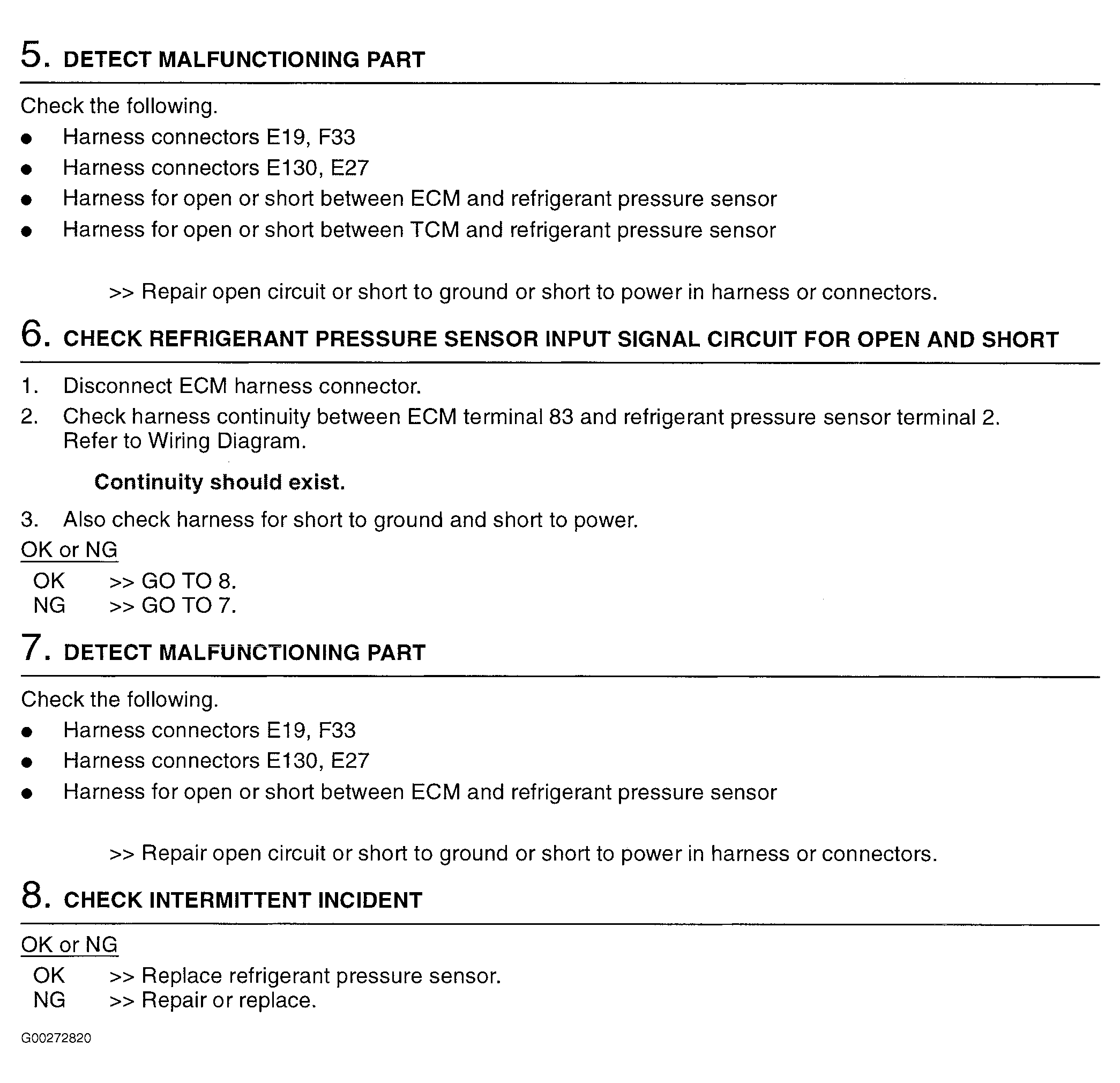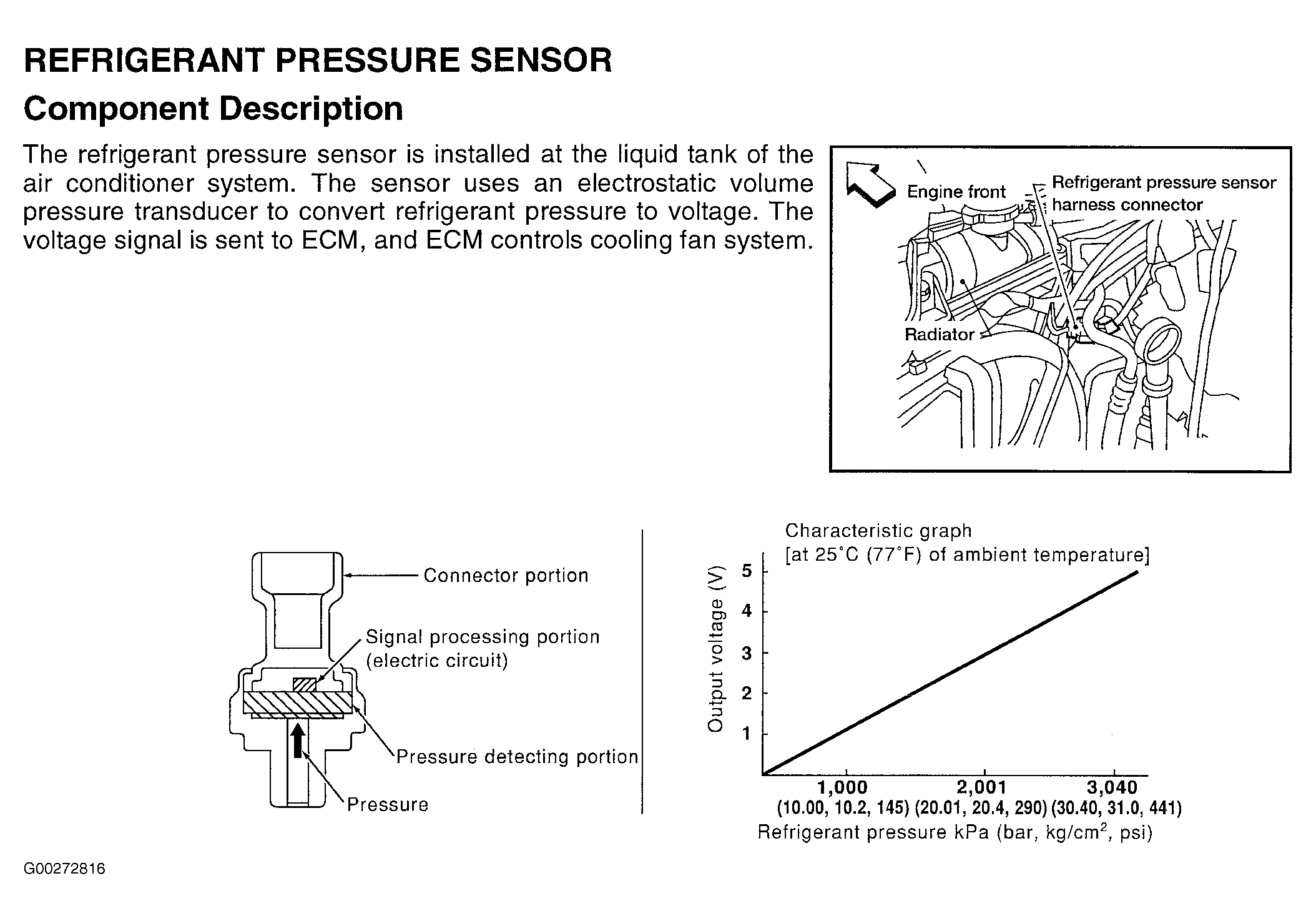 For refrigerant pressure sensor system and component testing, see Fig 1-Fig 5 . For engine control system component locations, see Figure-Figure . For ECM location, connector and terminal view, see Figure. If problem is intermittent, see INTERMITTENTS in TROUBLE SHOOTING - NO CODES article. For removal and installation of components, see appropriate REMOVAL & INSTALLATION article.