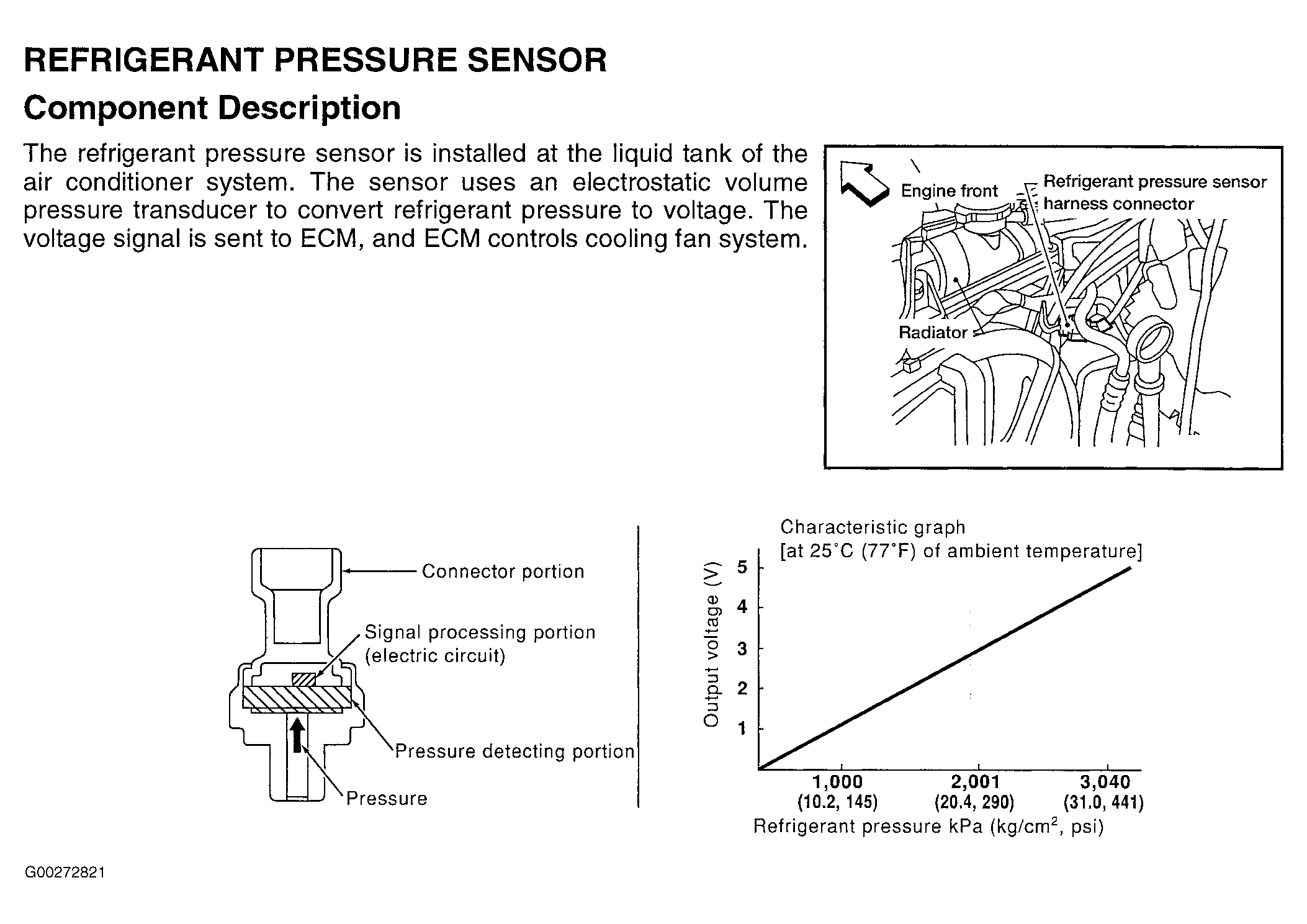 For refrigerant pressure sensor system and component testing, see Fig 1-Fig 5 . For engine control system component locations, see Figure-Figure . For ECM location, connector and terminal view, see Figure. If problem is intermittent, see INTERMITTENTS in TROUBLE SHOOTING - NO CODES article. For removal and installation of components, see appropriate REMOVAL & INSTALLATION article.