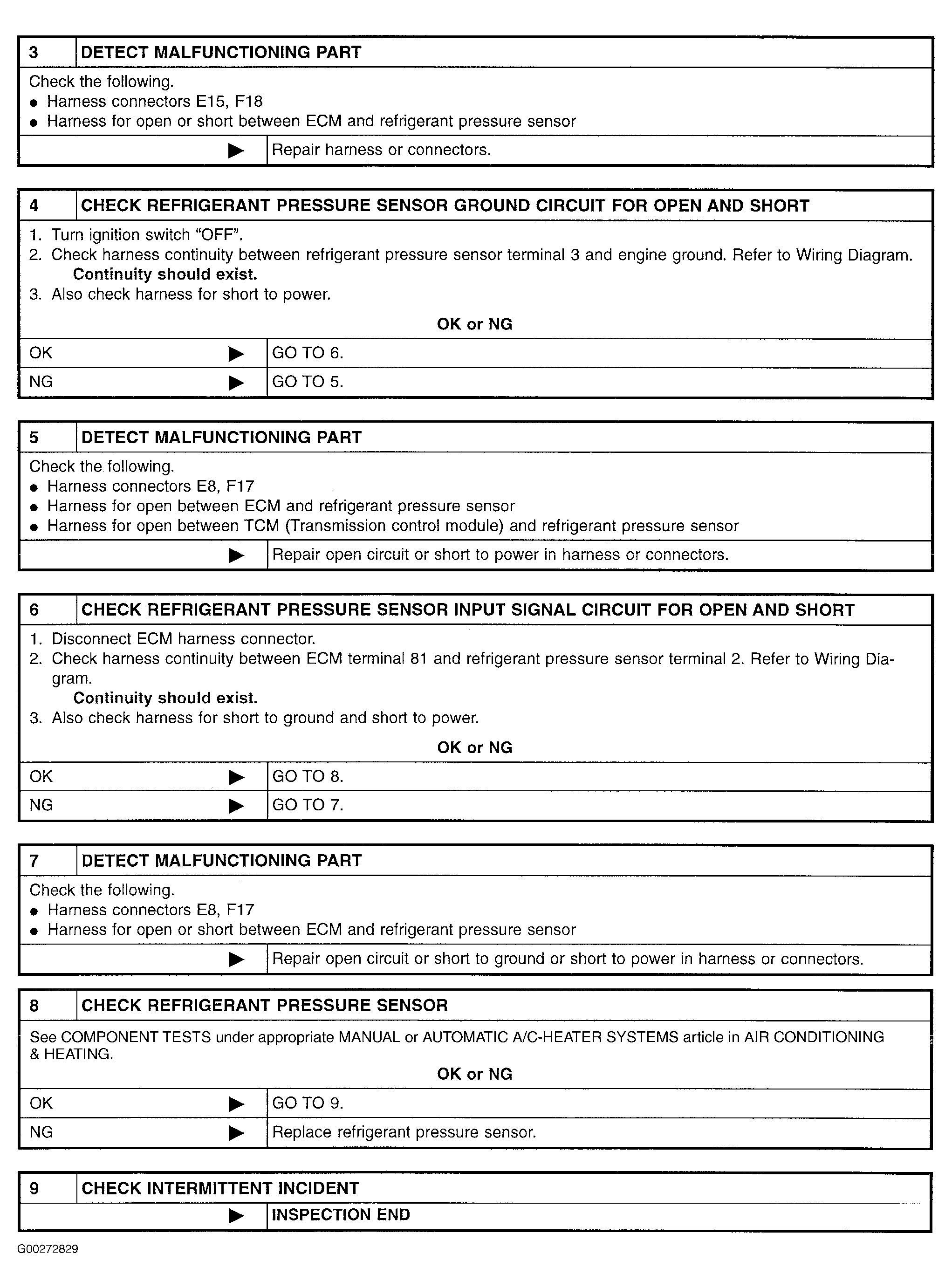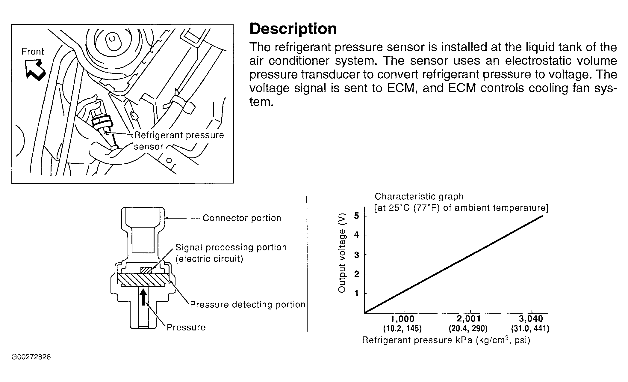 For refrigerant pressure sensor system and component testing, see Fig 1-Fig 4 . For engine control system component locations, see Figure-Figure . For ECM location, connector and terminal view, see Figure. If problem is intermittent, see INTERMITTENTS in TROUBLE SHOOTING - NO CODES article. For removal and installation of components, see appropriate REMOVAL & INSTALLATION article.