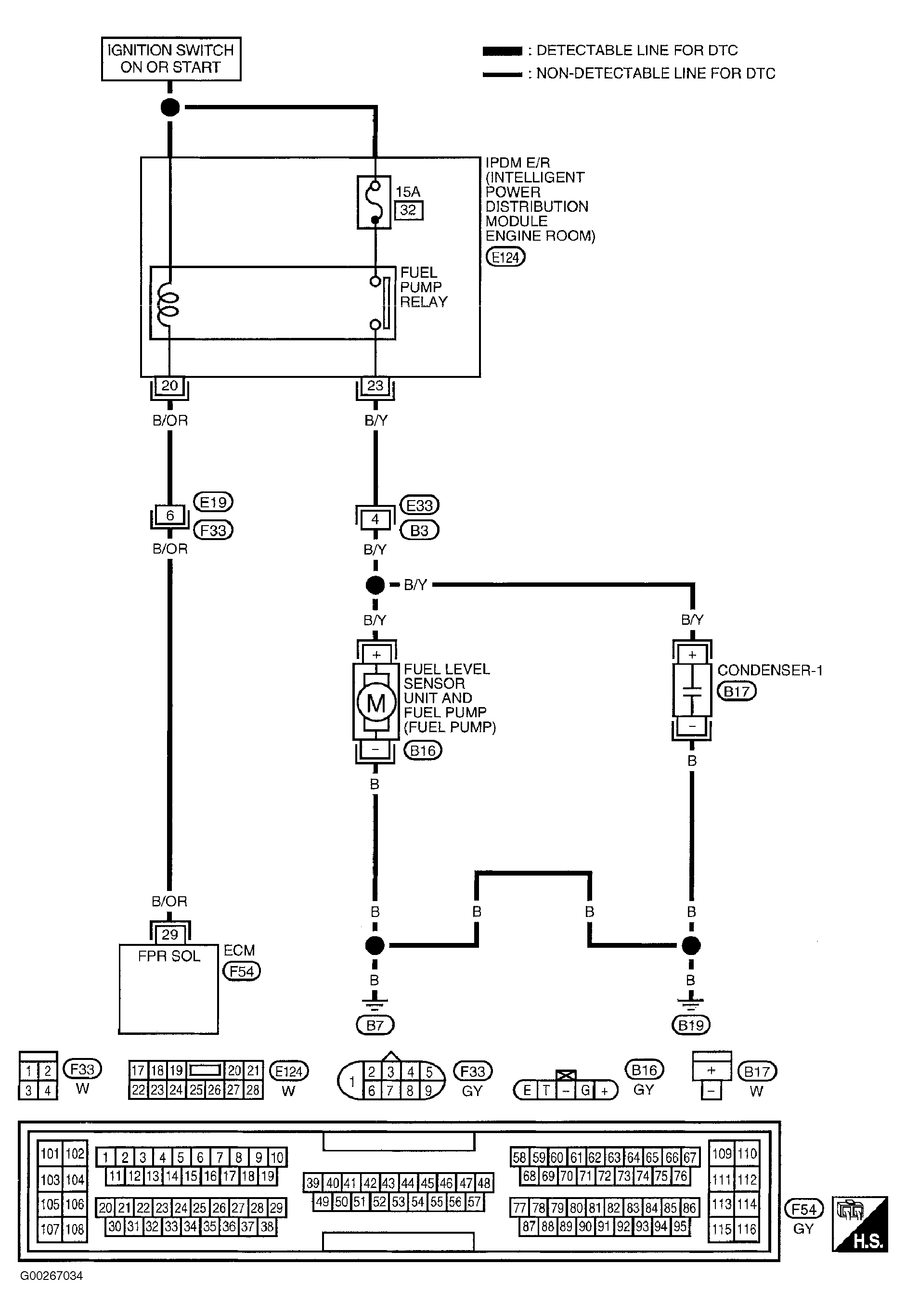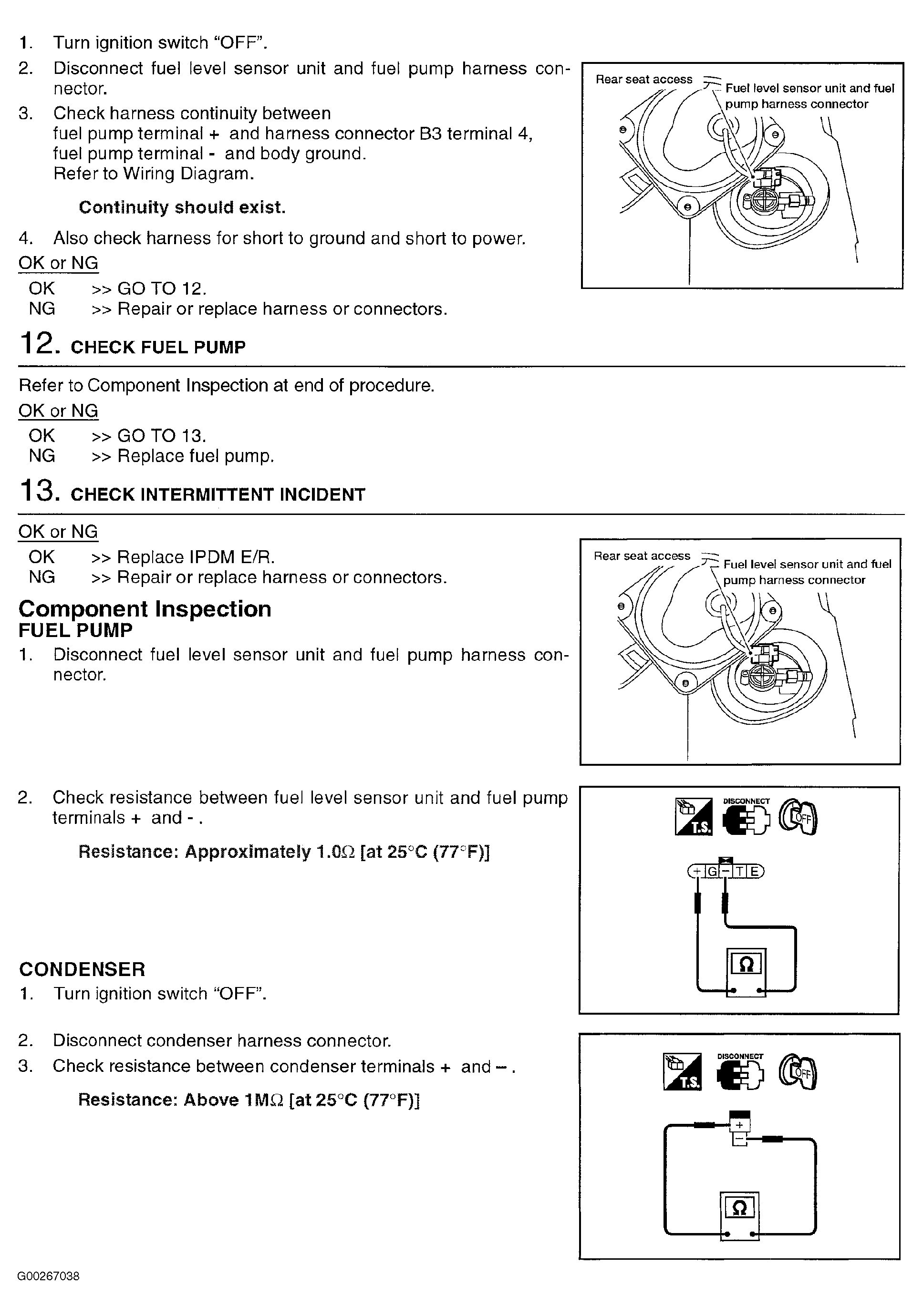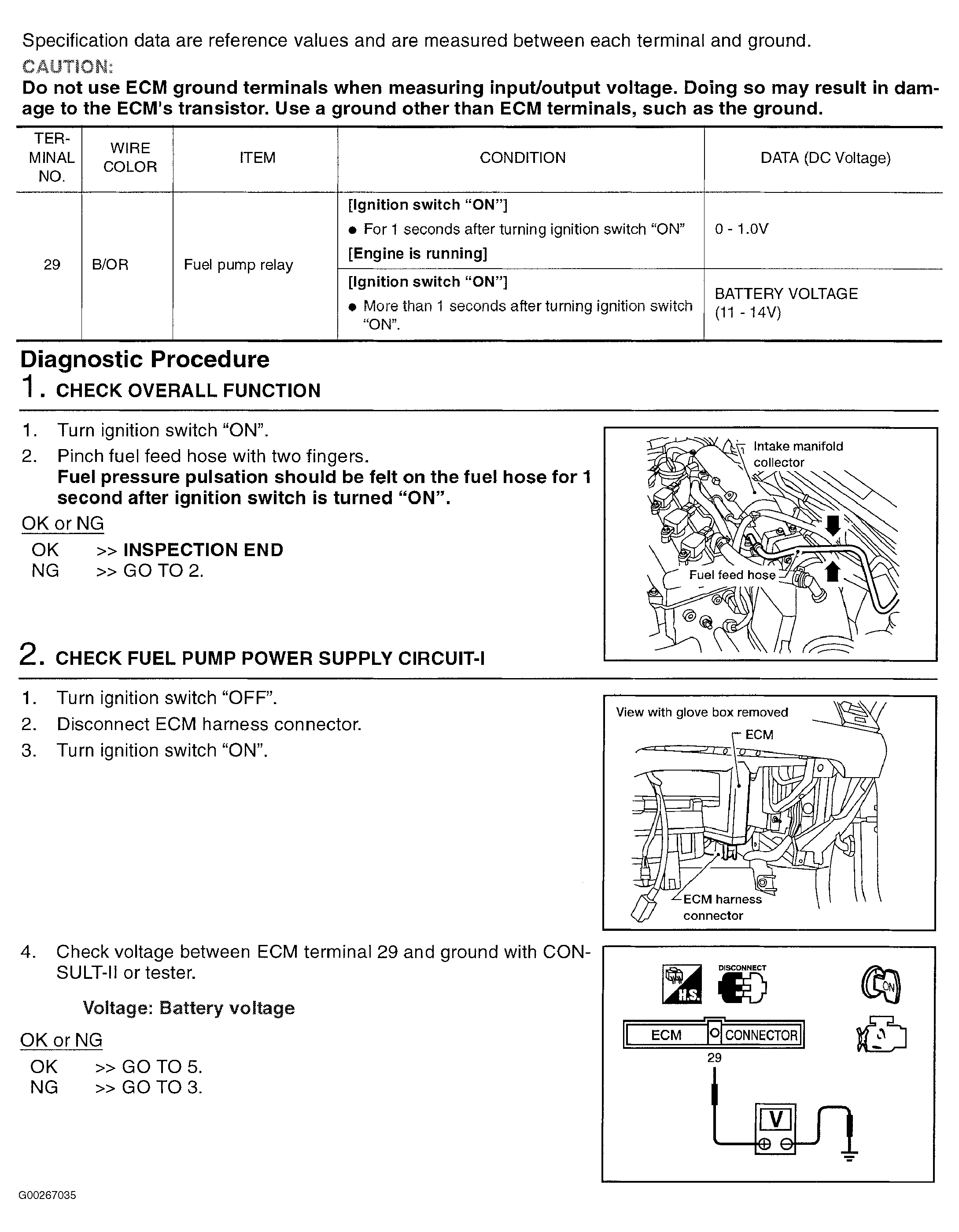 For fuel pump control system diagnosis and testing procedure, see Fig 2-Fig 5 . For fuel pump control circuit wiring diagram, see Fig 1. To check condenser, see FUEL SYSTEM CONDENSER . To check fuel pump, see FUEL PUMP . For relay location, see ECM & FUEL PUMP RELAY LOCATIONS table. If no problem is indicated at this time, problem may be intermittent. See INTERMITTENTS in TROUBLE SHOOTING - NO CODES article. For component removal and installation procedures, see appropriate REMOVAL & INSTALLATION article.