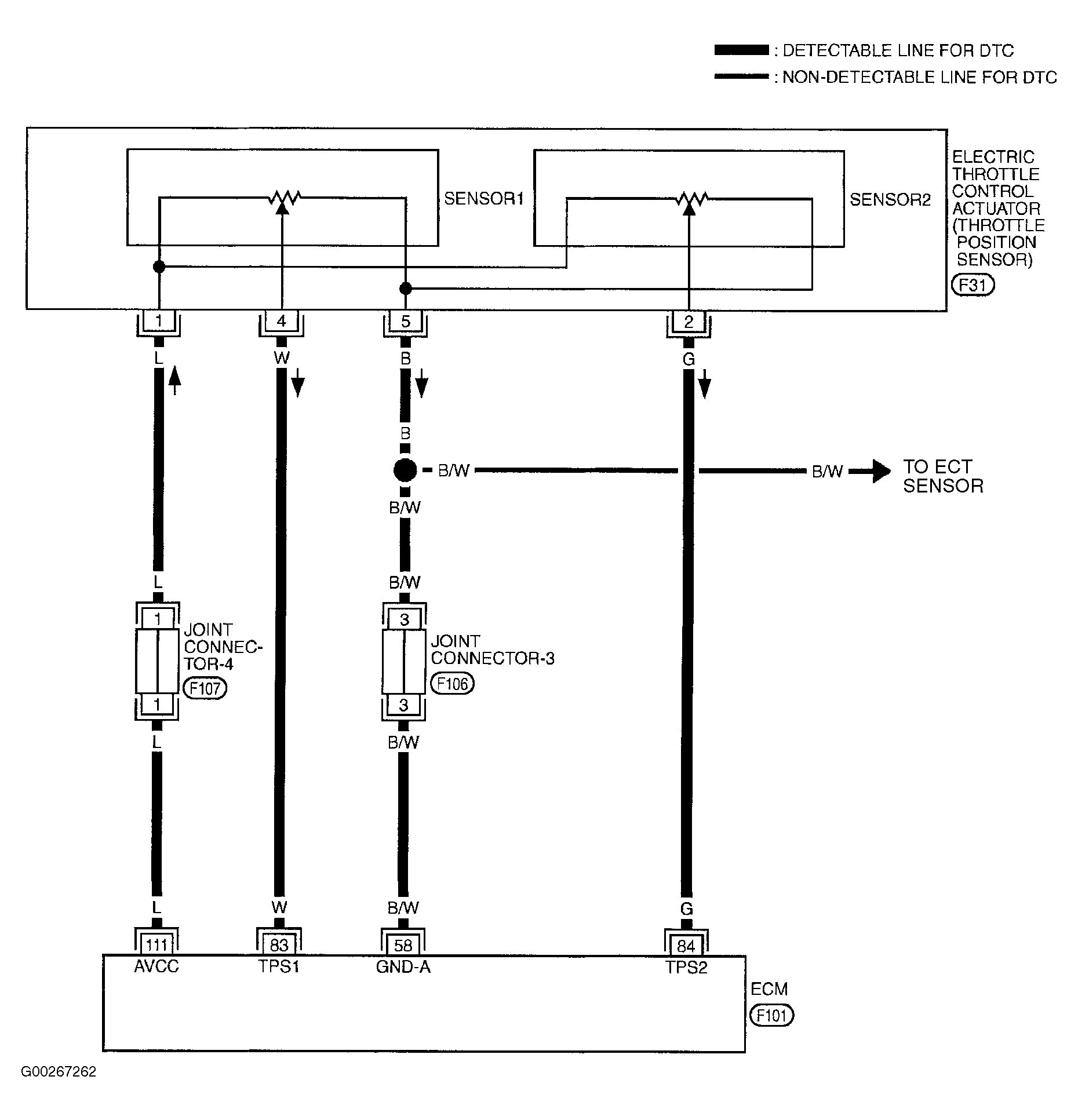 - Disconnect ECM harness connector F101. Check harness continuity between electric throttle control actuator harness connector F31 terminal No. 4 and ECM harness connector F101 terminal No. 83. Continuity should exist. Also check harness for short to ground and short to power. If problem is found, repair as necessary. If no problem is found, go to next step.
