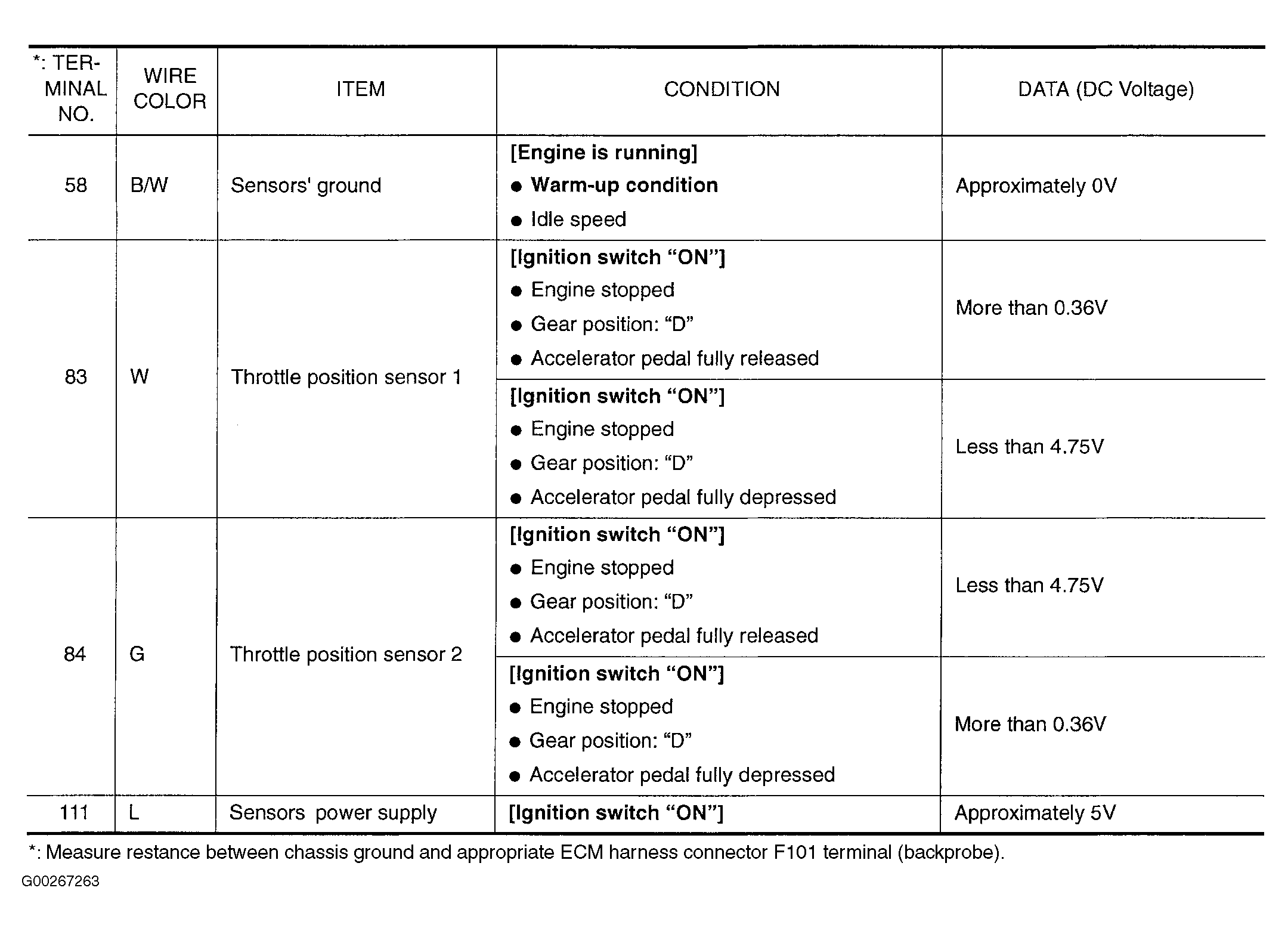 - Reconnect all harness connectors. Perform throttle valve closed position learning procedure. See THROTTLE VALVE CLOSED POSITION LEARNING under PROGRAMMING. Turn ignition on. Shift transmission into "D" position. Measure voltage between ground and ECM harness connector F101 terminals No. 83 and 84 by backprobing, with accelerator pedal in specified positions. See THROTTLE POSITION SENSOR VOLTAGE table. If problem is found, go to next step. If no problem is found, go to step 9 .