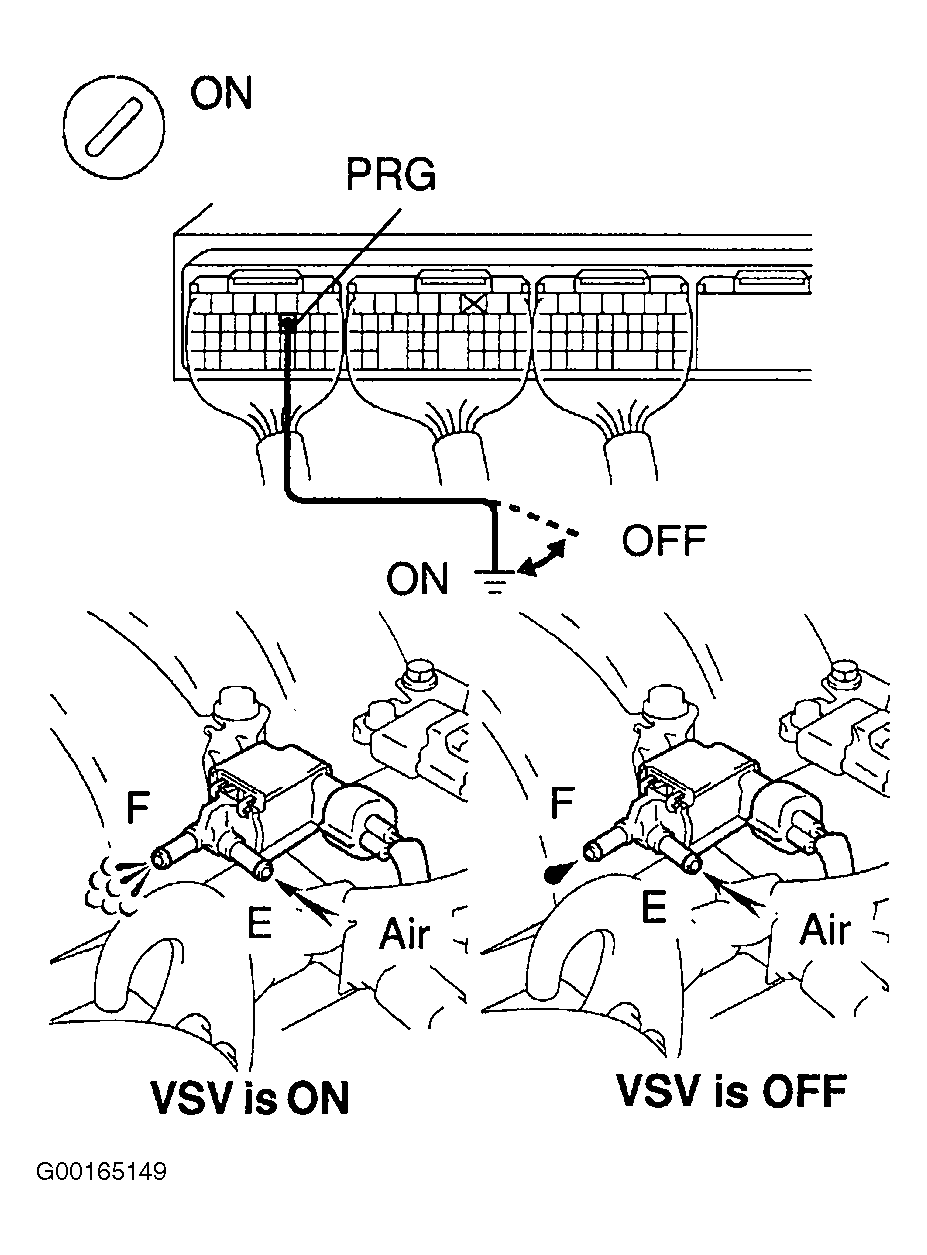 13. Remove the engine room ECU cover. Turn the ignition switch ON. Check the VSV function. Connect jumper wire between terminal PRG of the ECM connector and body ground (ON). Disconnect jumper wire between terminal PRG of the ECM connector and body ground (OFF). When VSV is ON, air from port "E" flows out through port "F", When VSV is OFF, air does not flow from port "E" to port "F". See Fig 1. If okay, go to step  16. If not okay, go to next step.