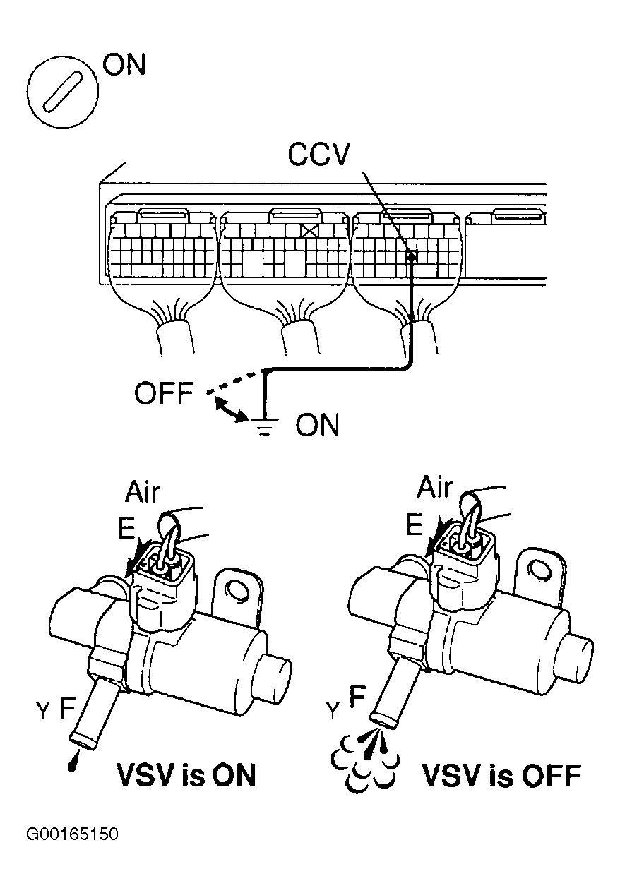 16. Check VSV function by connecting a jumper wire between terminal CCV of the ECM connector and body ground (ON), then disconnect jumper wire between terminal CCV of the ECM connector and body ground (OFF). When VSV is ON, air does not flow from port "E" to port "F". When VSV is OFF, air from port "E" flows out through port "F". See Fig 3. If okay, go to step  19. IF not okay, go to next step.