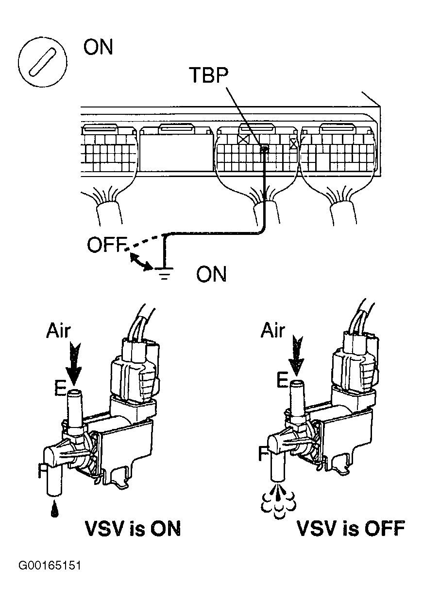 19. Remove engine room ECM cover. Turn ignition on. Backprobing connector, connect a fused jumper wire between ground and terminal TBP of the ECM connector and body ground (ON), then disconnect wire between terminal TBP of the ECM connector and body ground (OFF). When VSV is ON, air from port "E" flows out through port "F". When VSV is off, air does not flow from port "E" to port "F". See Fig 5. If VSV functions as specified, go to step  22. If not, go to next step.