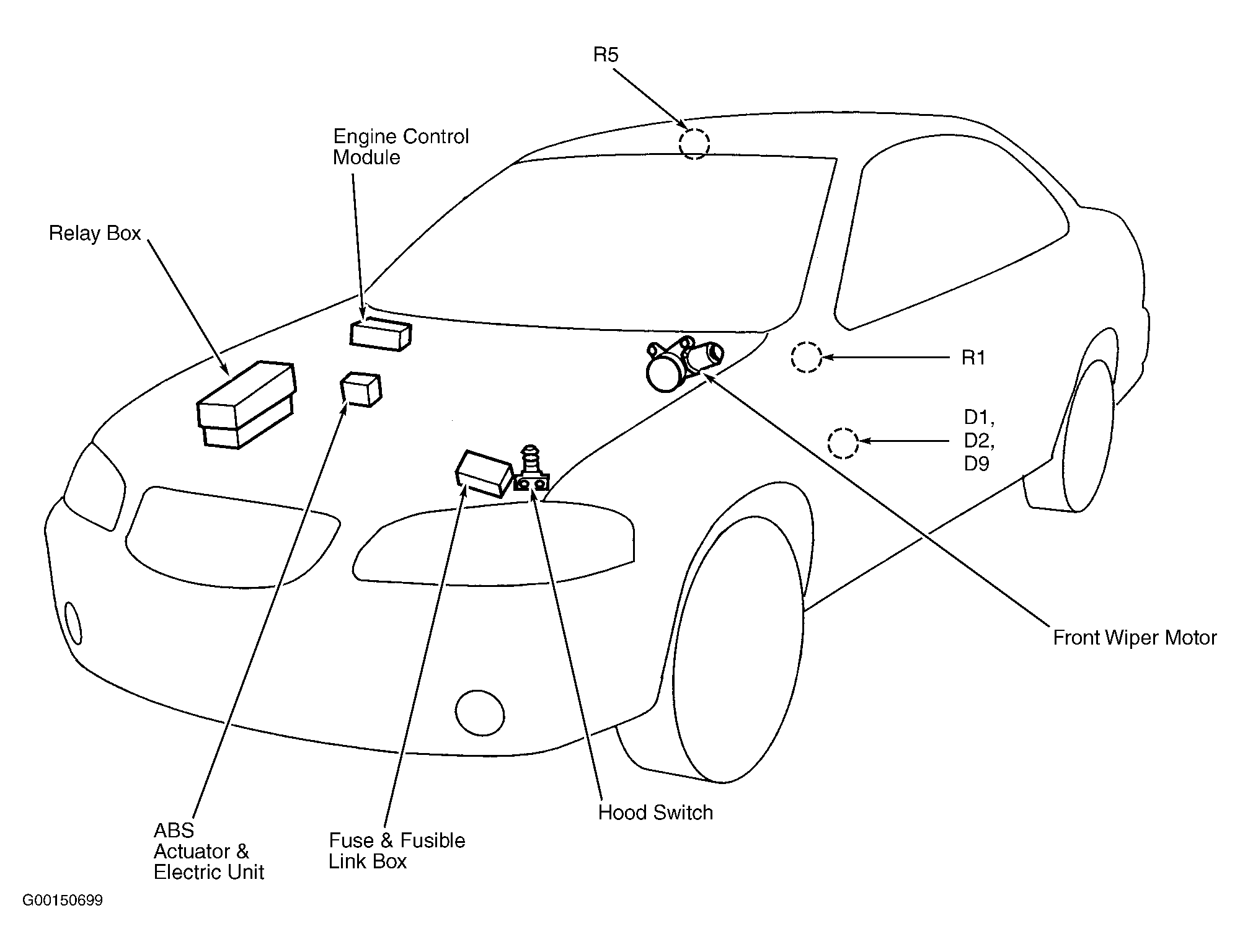 | ABS Actuator & Electric Unit | At right rear of engine compartment. See Figure. |
