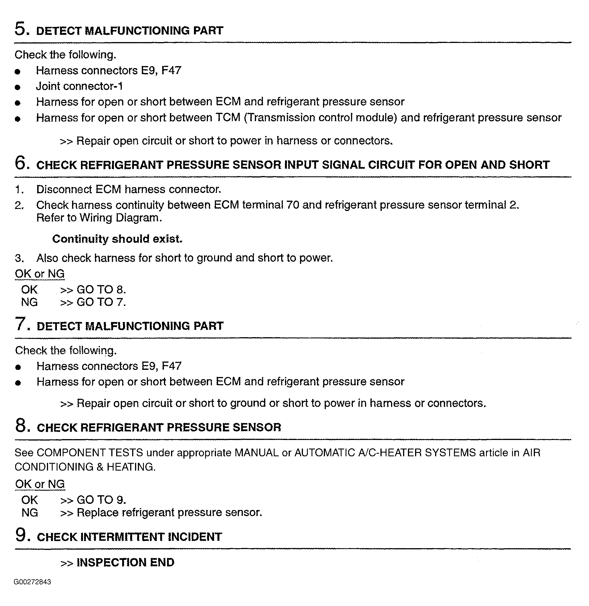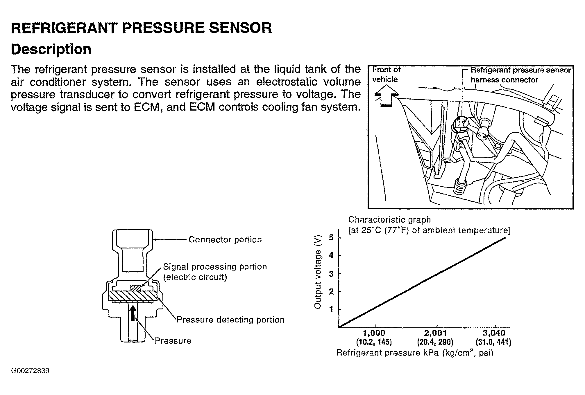 For refrigerant pressure sensor system and component testing, see Fig 1-Fig 5 . For engine control system component locations, see Figure-Figure . For ECM location, connector and terminal view, see Figure. If problem is intermittent, see INTERMITTENTS in TROUBLE SHOOTING - NO CODES article. For removal and installation of components, see appropriate REMOVAL & INSTALLATION article.