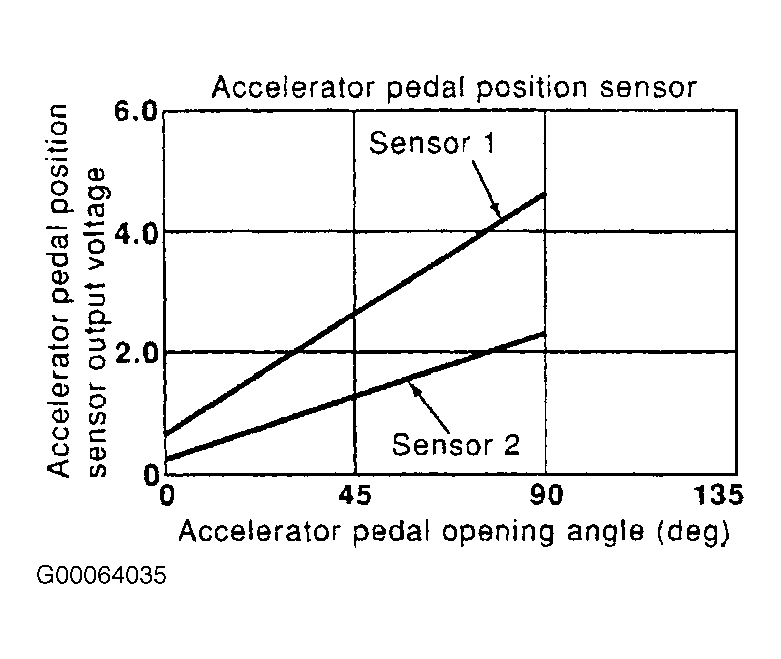 APP sensor has 2 sensors. These sensors are a kind of potentiometers which transform the accelerator pedal position into output voltage, and emit the voltage signal to the ECM. See Figure . In addition, these sensors detect the opening and closing speed of the accelerator pedal and feed the voltage signals to the ECM. The ECM judges the current opening angle of the accelerator pedal from these signals and controls the throttle control motor based on these signals.