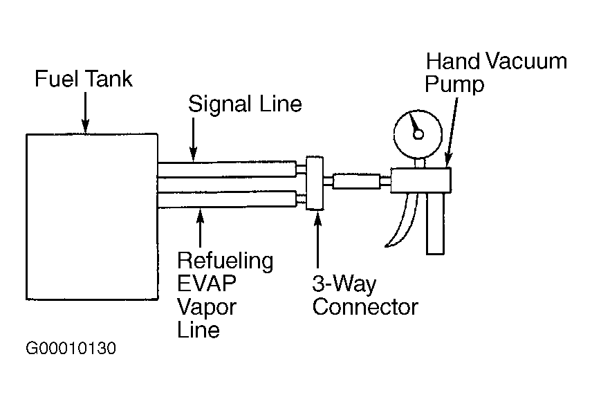 2. Leave both hoses connected to fuel tank. Blow air into refueling EVAP vapor line hose. Air should flow freely into fuel tank. Blow air into signal line hose. Air should not flow. Using a hand pressure pump with a "T", apply 2.9 psi (20.0 kPa) of pressure to both hoses. See Fig 2. Air should not leak. If operation is as specified, refueling control valve is okay. If operation is not as specified, replace fuel tank.