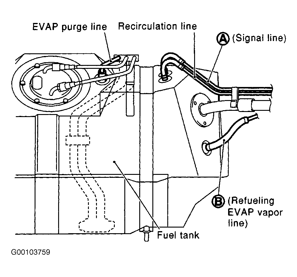 1. Remove fuel filler cap. Disconnect signal line hose from fuel filler tube. Disconnect refueling EVAP vapor line hose from tube. See Fig 1.
