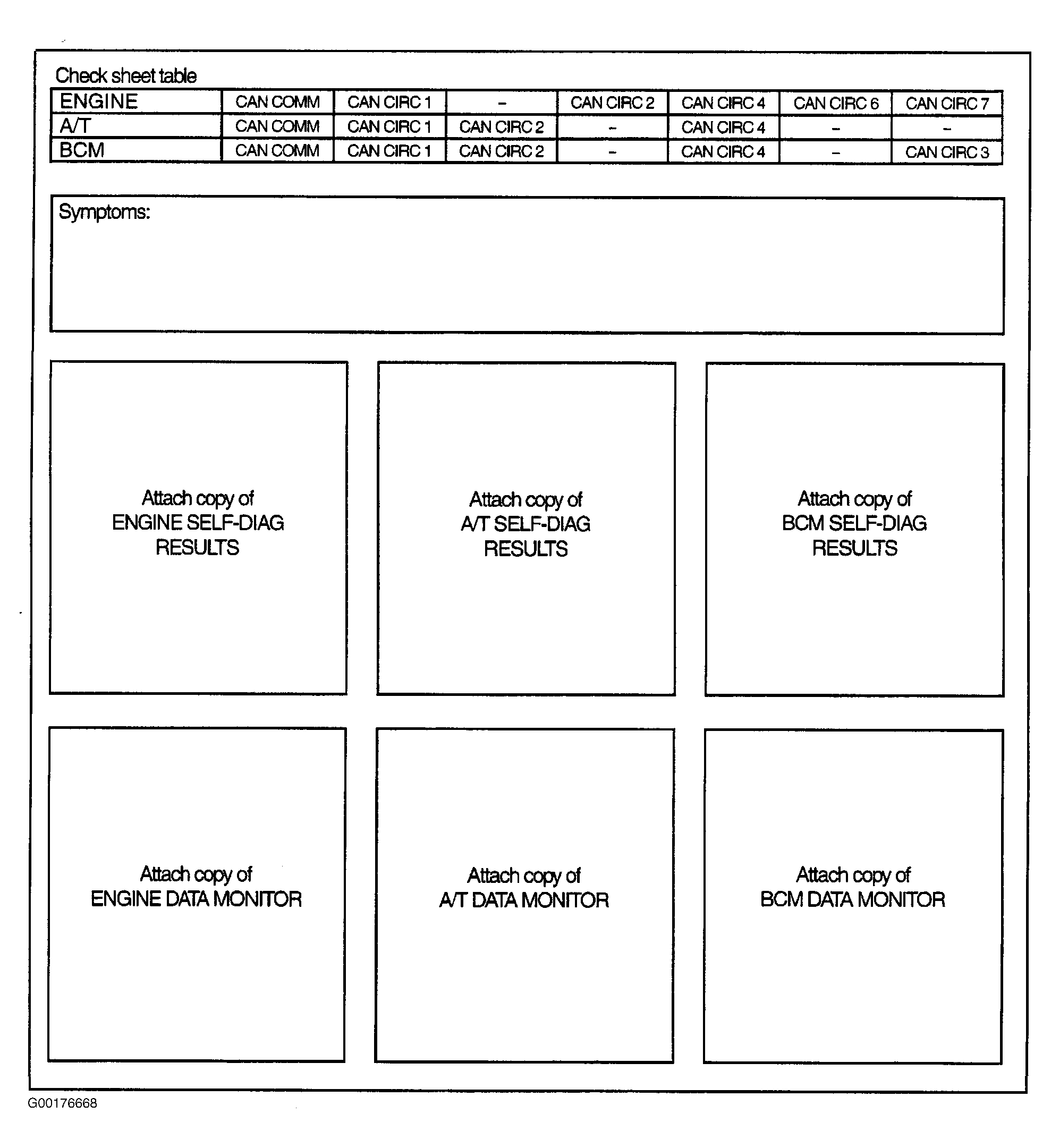 Print all the data of SELF-DIAG RESULTS and DATA MONITOR for "ENGINE", "A/T" and "BCM" displayed on CONSULT-II. See SELF-DIAGNOSTIC RESULTS MODE (WITH A/T 2.5L) and DATA MONITOR MODE (WITH A/T 2.5L) and ENGINE SELF-DIAGNOSTIC RESULTS MODE (3.5L) and ENGINE DATA MONITOR MODE (3.5L) for "ENGINE", A/T SELF-DIAGNOSTIC RESULTS TEST MODE for "A/T" and USING CONSULT-II in BODY CONTROL MODULE - ALTIMA, for "BCM". Attach the printed sheet of "SELF-DIAGNOSTIC RESULTS" and "DATA MONITOR" onto the check sheet. See Fig 1 . Based on the data monitor results, put "Check" marks onto the items with "UNKWN" or "NG" in the check sheet table. See Fig 1 . According to the check sheet results (example), start inspection. See Fig 2 and Fig 3 . Based on the data monitor results, put check marks onto the items with "UNKWN" or "NG" in the check sheet table.