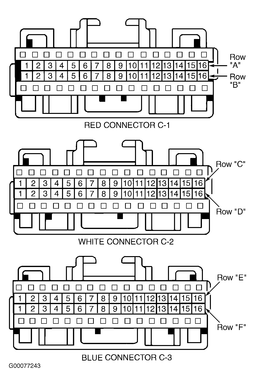 - Turn ignition off. Disconnect PCM 32-pin harness connectors C-1 (Red), C-2 (White) and C-3 (Blue). PCM is located under center console in front of shifter. Turn ignition on. Check for poor connections, opens or shorts in 5-volt reference circuits for suspect sensors. See WIRING DIAGRAMS article. If problem is found, go to next step. If no problem is found, leave harness connector disconnected and go to step 4 .