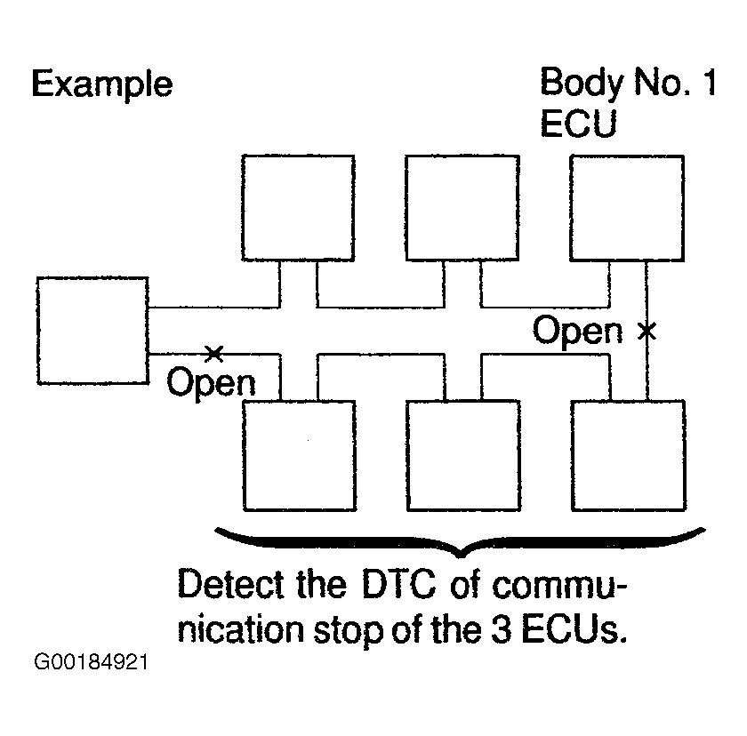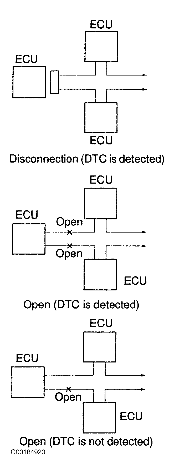- If the DTC of the ECU communication stop is output, there is a possibility of connector disconnection or 2 communication buses open. See Fig 1. It will not become abnormal with only 1 communication bus open.