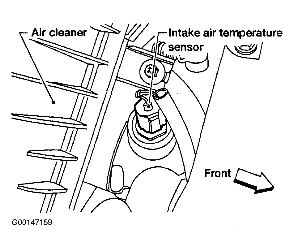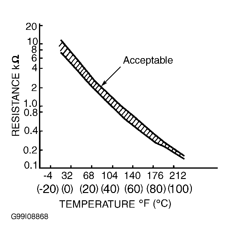 - Remove IAT sensor, and place in heated water. Measure resistance between IAT sensor terminals. Resistance should be within acceptable range shown in illustration. See Fig 5 . If resistance is as specified, go to next step. If resistance is not as specified, replace IAT sensor.