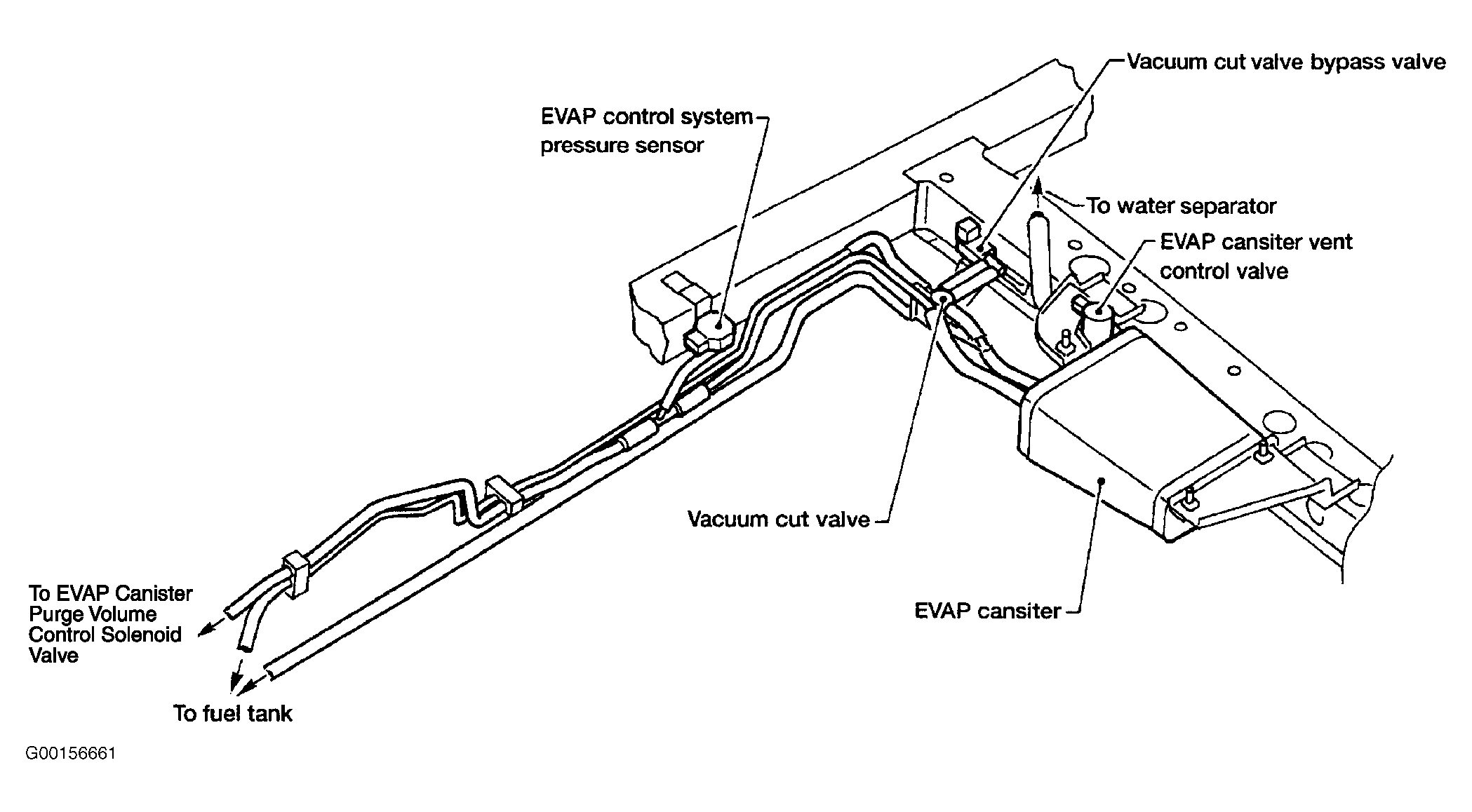 - Inspect EVAP canister for damage. Replace, if necessary. Also, check hose between water separator and EVAP canister for blockage or poor connection. If problem is found, repair as necessary. If problem is not found, go to next step.