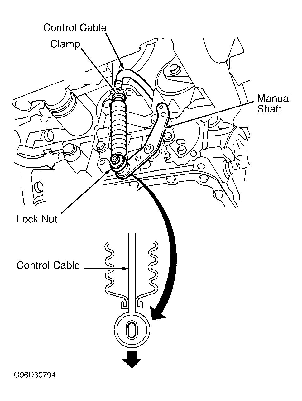 - Loosen shift cable lock nut and place manual lever in "P" position.