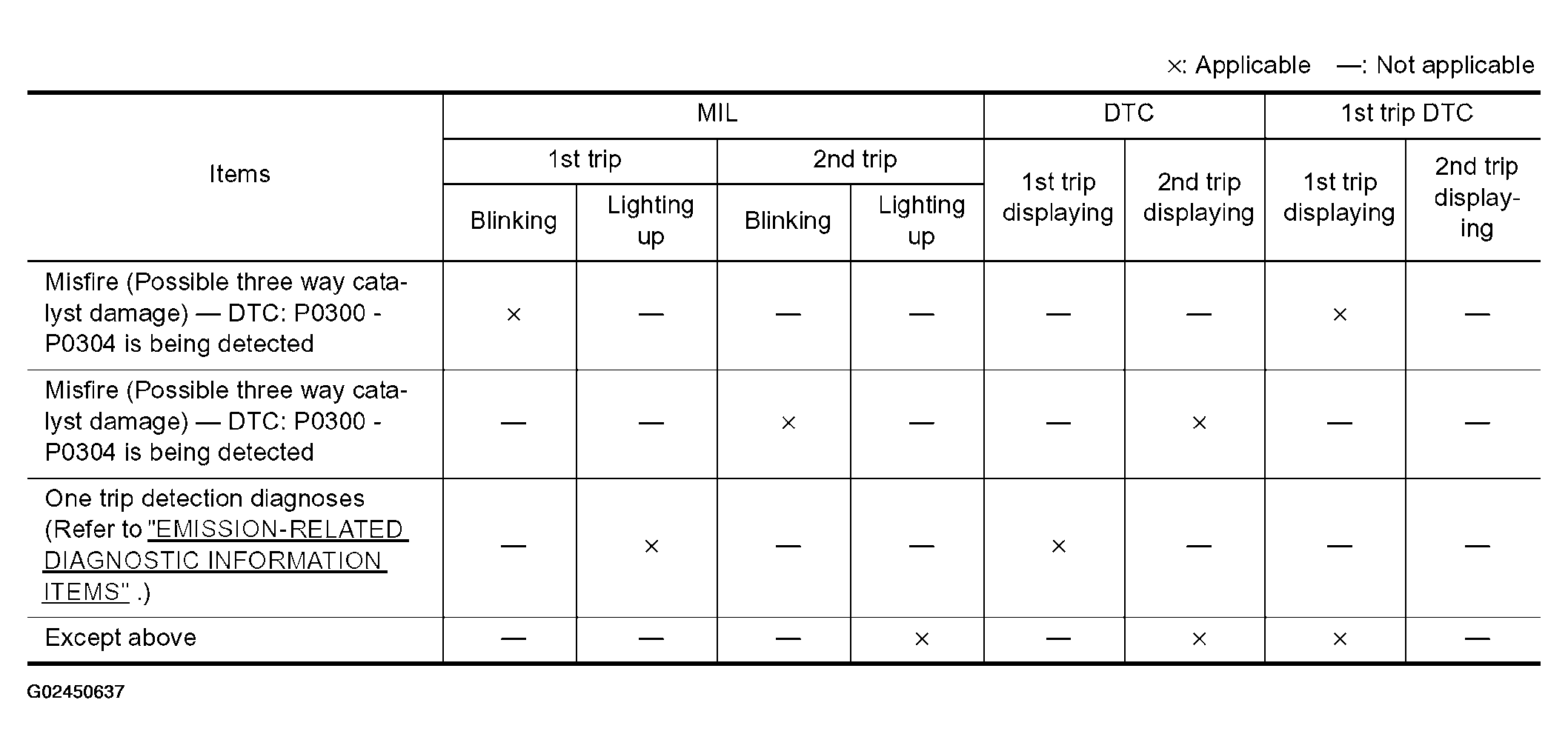 If the same malfunction is detected again during the next drive, the DTC and Freeze Frame data are stored in the ECM memory, and the MIL lights up. The MIL lights up at the same time when the DTC is stored. <2nd trip> The "trip" in the "Two Trip Detection Logic" means a driving mode in which self-diagnosis is performed during vehicle operation. Specific on board diagnostic items will cause the ECM to light up or blink the MIL, and store DTC and Freeze Frame data, even in the 1st trip, as shown in Fig 1.