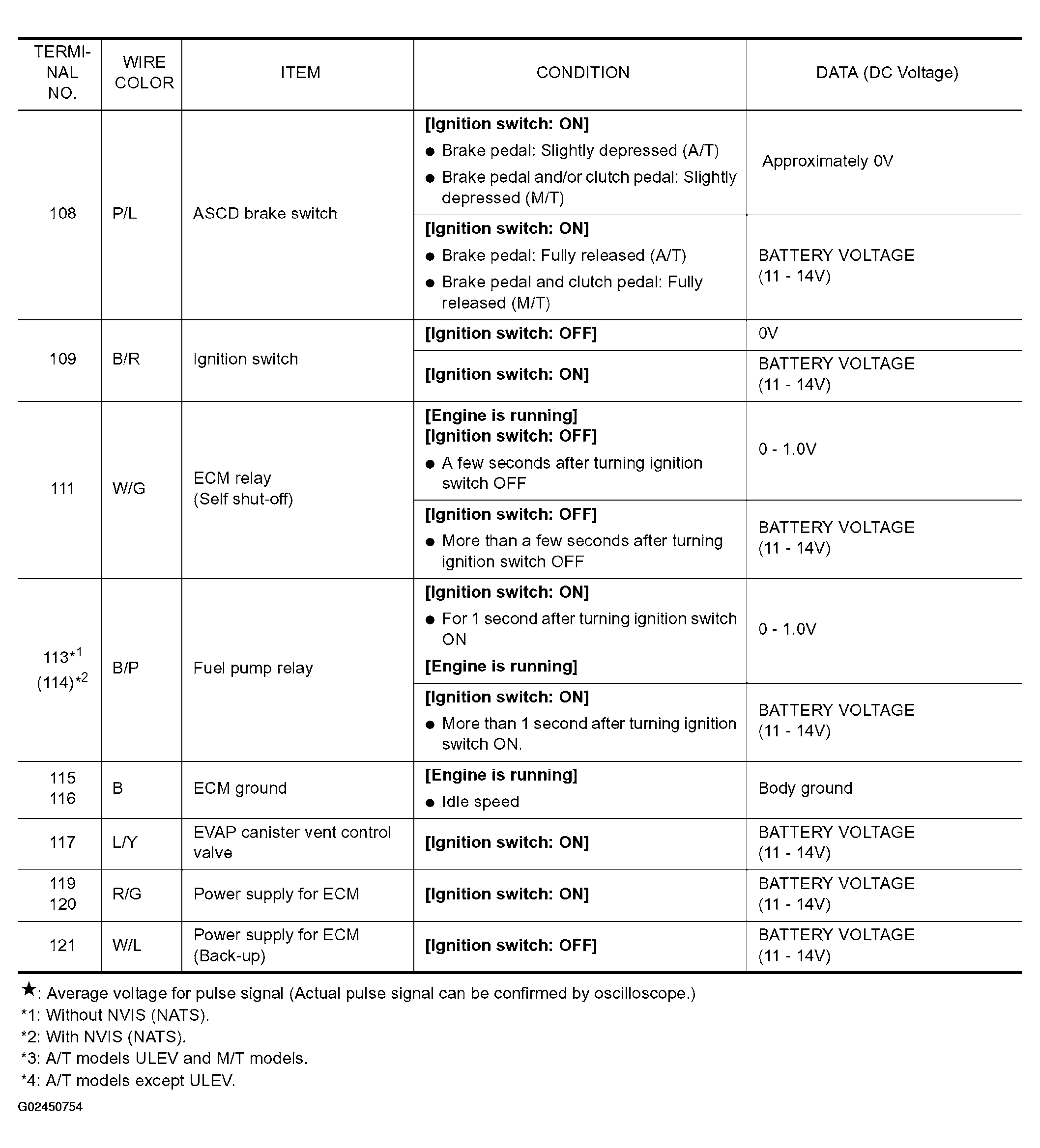 Specification data are reference values and are measured between each terminal and ground. Pulse signal is measured by CONSULT-II.