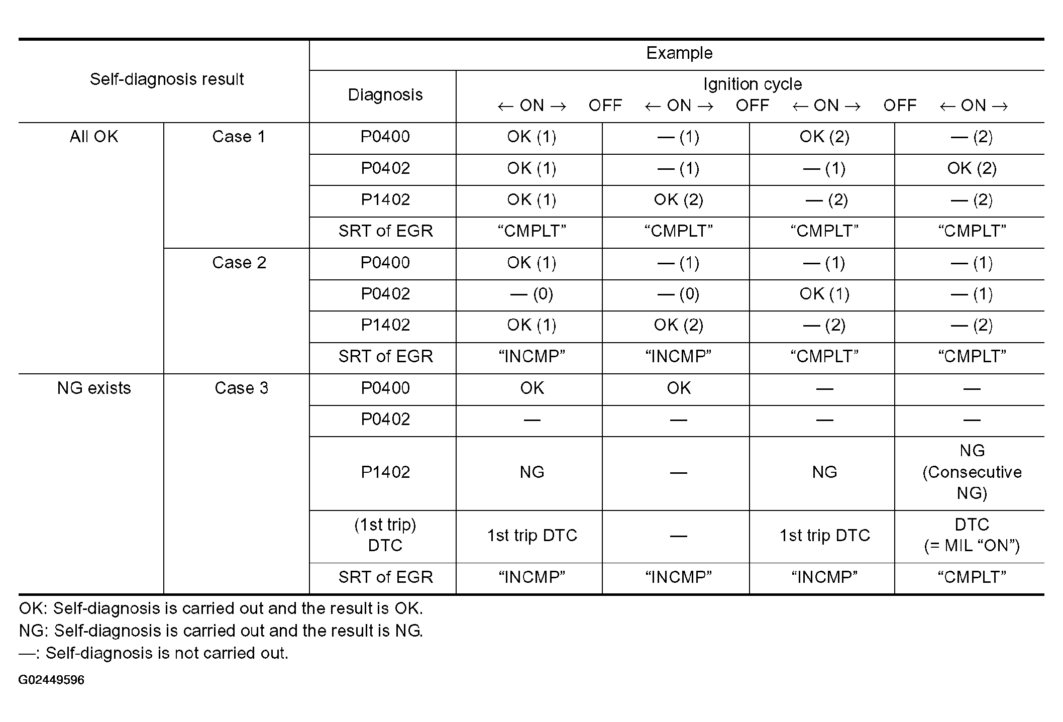 SRT is set as "CMPLT" after self-diagnosis has been performed one or more times. Completion of SRT is done regardless of whether the result is OK or NG. The set timing is different between OK and NG results and is shown in the table below in Fig 1.