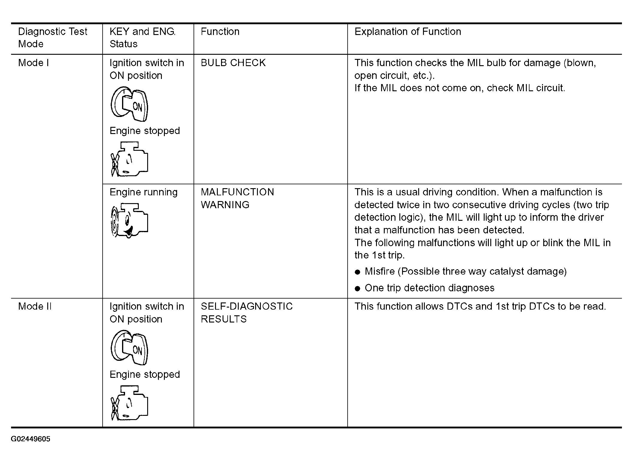Therefore, when electrical controlled throttle and part of ECM related diagnoses are continuously detected as NG for 5 trips, ECM warns the driver that engine control system malfunctions and MIL circuit is open by means of operating fail- safe function.