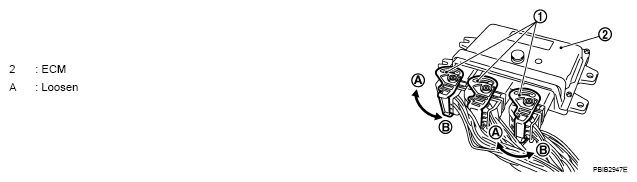 - Before connecting or disconnecting the ECM harness connector, turn ignition switch OFF and disconnect negative battery cable. Failure to do so may damage the ECM because battery voltage is applied to ECM even if ignition switch is turned OFF.