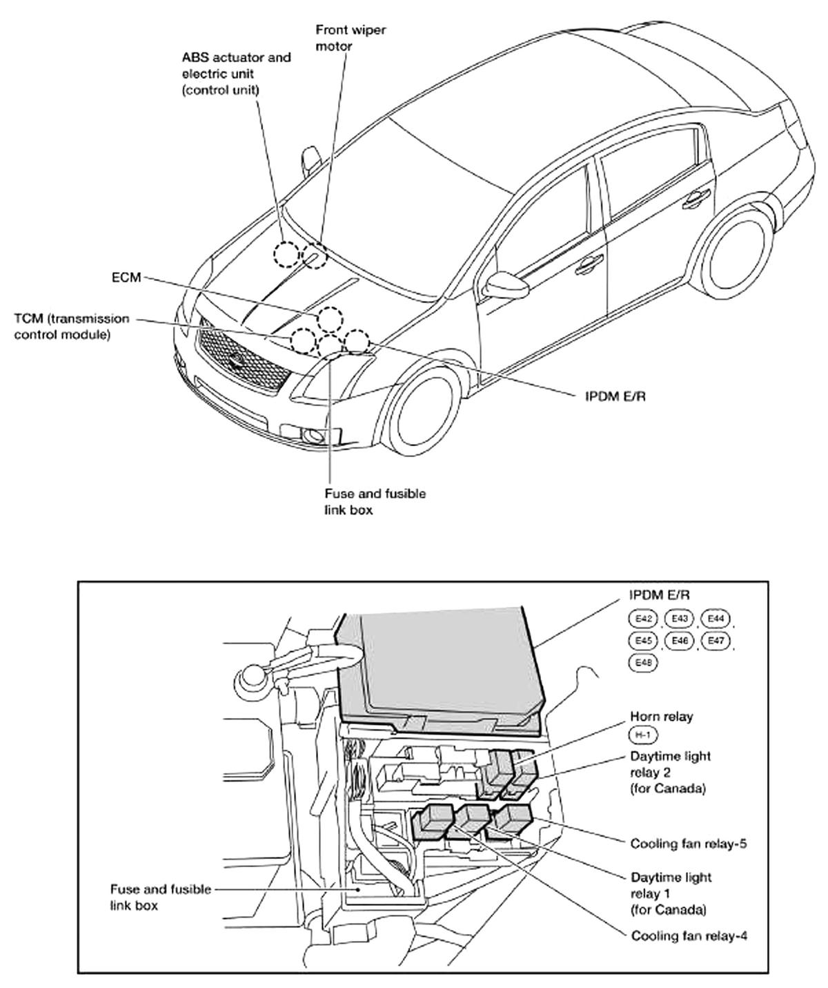 | IPDM E/R (Intelligent Power Distribution Module Engine Room). | Left front of engine compartment. See Figure. |