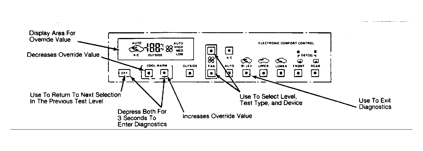 To enter the service mode, turn the ignition switch to the "ON" position. Touch the "OFF" and "WARM" buttons on the ECC control panel simultaneously, and hold until a segment check is displayed on the instrument panel and ECC control panel. See Fig 1 .