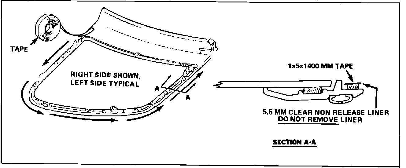 2. Apply tape, part number 12393610, to the inside surface of the outer flange of the window module for the entire periphery of the module and cut off the excess. DO NOT REMOVE THE CLEAR LINER OF THE TAPE. (Figure 1)