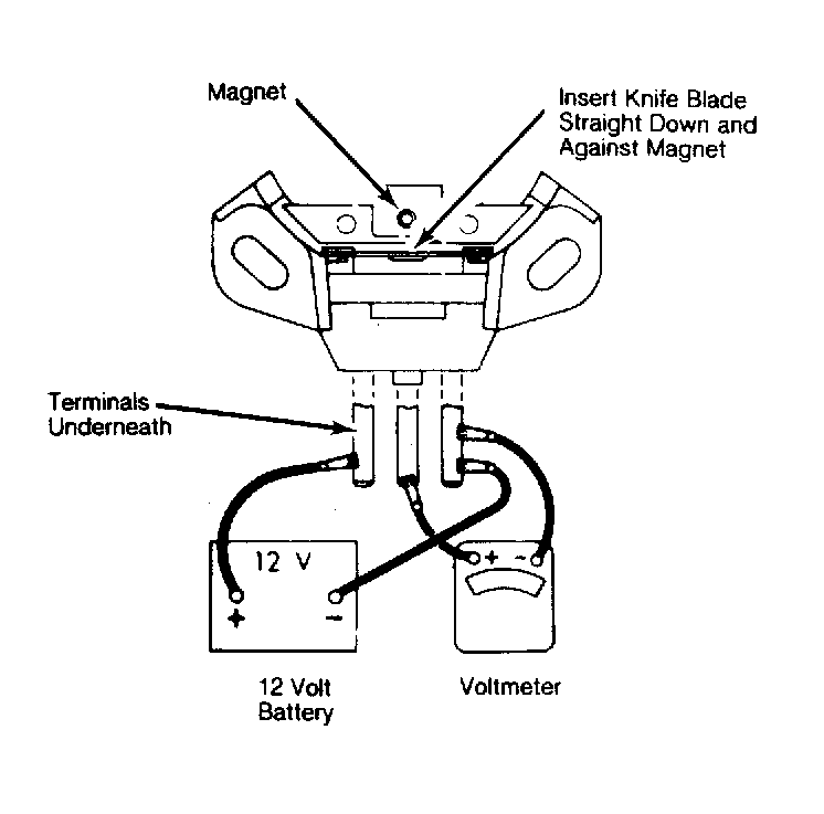2. Insert knife blade straight down between magnet and Hall Effect switch. See Fig 1. Voltmeter should read within 0.5 volts of battery voltage. With knife blade removed, voltmeter should read between 0 and 0.5 volts. If voltage readings are not as specified, replace Hall Effect switch.