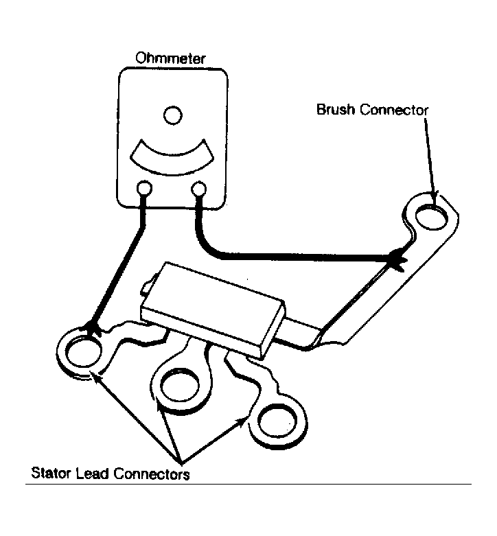 - Remove diode trio from end frame assembly. Connect one ohmmeter lead to brush connector and second lead to one of 3 stator lead connectors. Reverse ohmmeter probes. See Fig 1. If one high and one low reading is obtained, diode trio is okay. If readings are identical, replace diode trio.