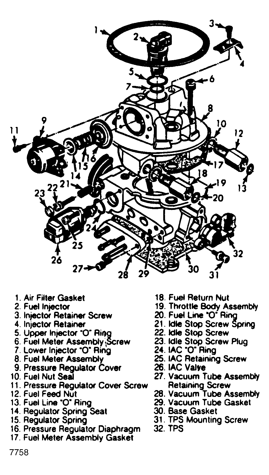 Remove fuel meter-to-throttle body retaining screws. Remove fuel meter assembly. See Fig 1 . Discard gasket. If fuel pressure regulator cover is removed, regulator diaphragm must be replaced to prevent fuel leaks.