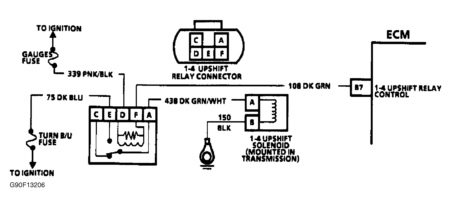 - If test light illuminated when touched to both terminals, ground ALDL "test" terminal "B" and connect test light from battery voltage to terminal "F" of 1-4 shift relay harness connector.