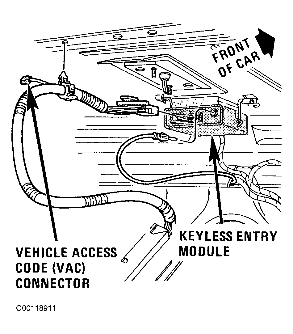 NOTE: The complete reprogramming procedure must be completed within 30 seconds of grounding the Vehicle Access Code (VAC) connector. If reprogramming procedure is not completed in 30 seconds, remove the ground from the connector and repeat procedure.