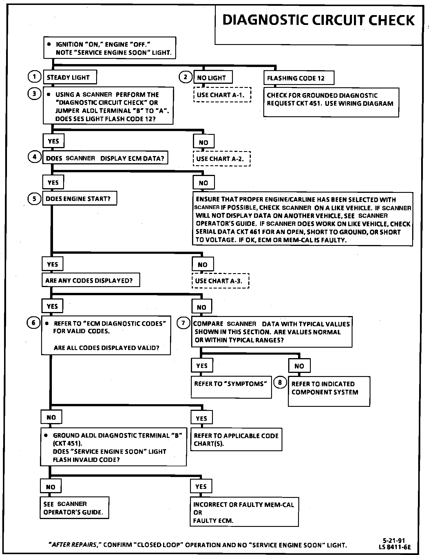 4. Most of the diagnostic charts use a Scan Tool to aid diagnosis, therefore, serial data must be available. If a MEM-CAL error is present, the ECM may have been able to flash Code 12 or 51, but not transmit serial data.