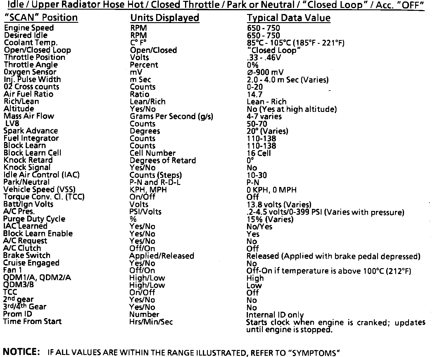 7. Comparison of actual control system data with the typical values is a quick check to determine if any parameter is not within limits. Keep in mind that a base engine problem (i.e. advanced cam timing) may substantially alter sensor values.