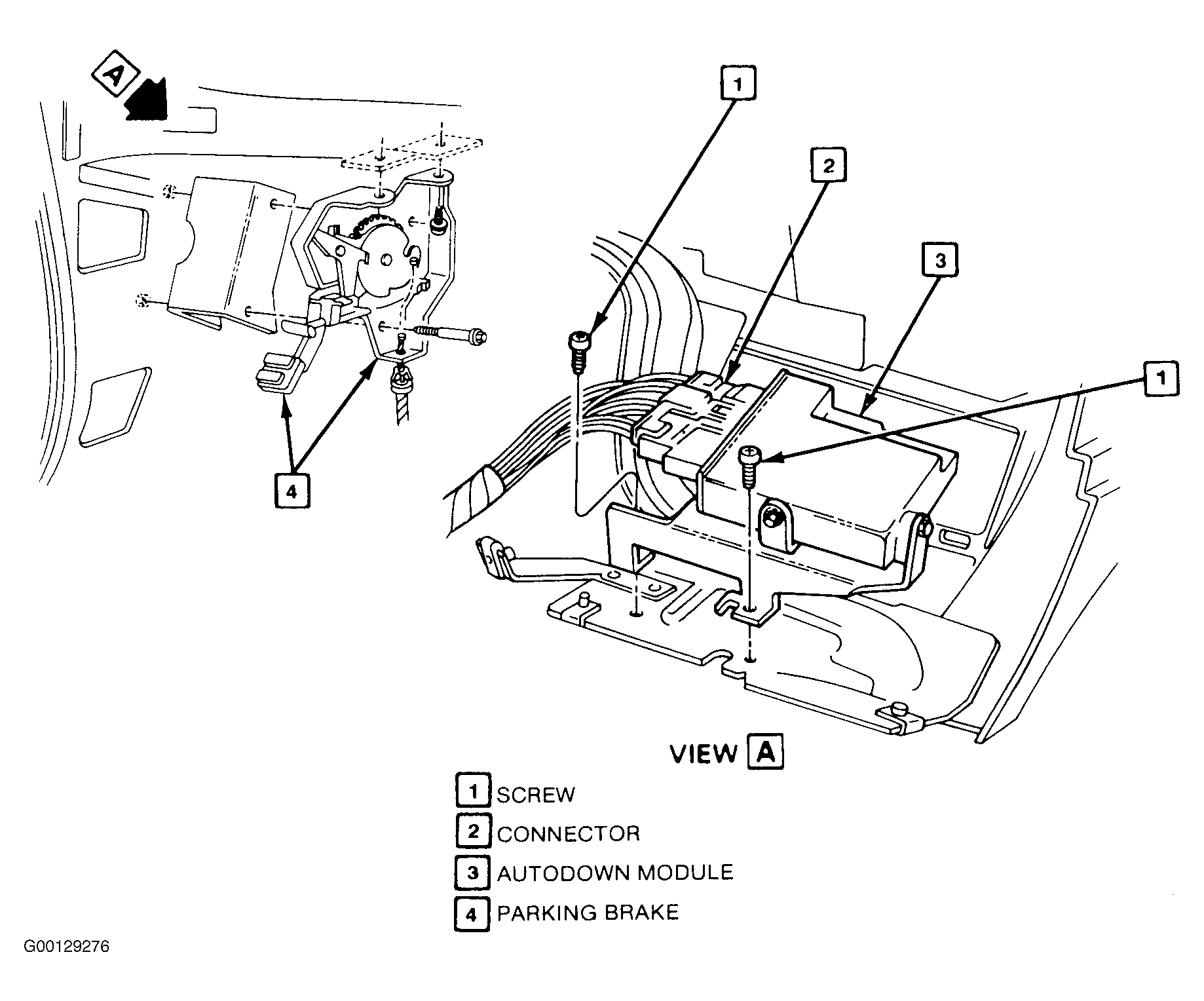 - Install parking brake lever assembly, switch, and release handle. See PARKING BRAKE LEVER ASSEMBLY .