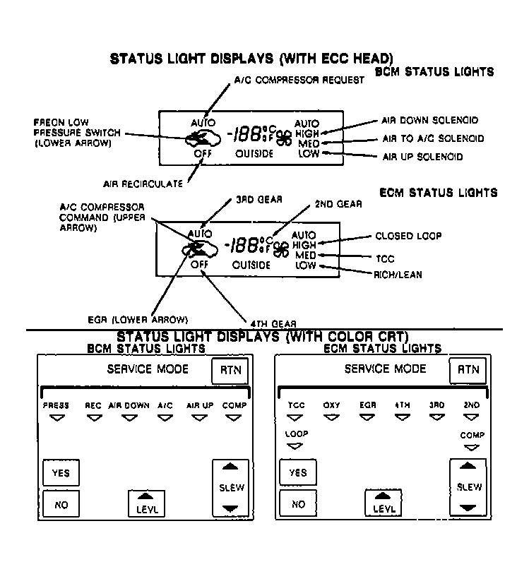 During self-diagnostics, status light display on ECCP or CRT monitor is used to indicate switchable parameter status. Each parameter status is indicated by its status light being turned on or off. Status light indicators are relative to system level being tested (BCM or ECM). See Fig 1 .