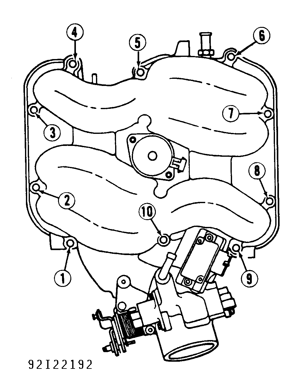 3. Pressurize fuel system and check for fuel leak. Install upper intake manifold assembly. Tighten upper intake manifold bolts and nuts to 90 INCH lbs. (10 N.m) and in sequence. See Fig 2.