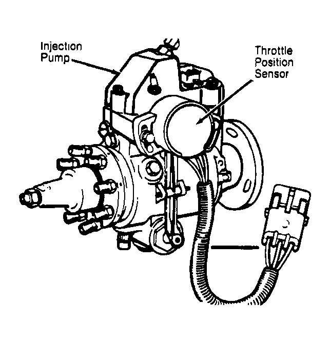 - Remove air cleaner assembly and related hoses. Disconnect TP sensor connector. Remove 2 screws and throttle position sensor from injection pump. See Fig 1.