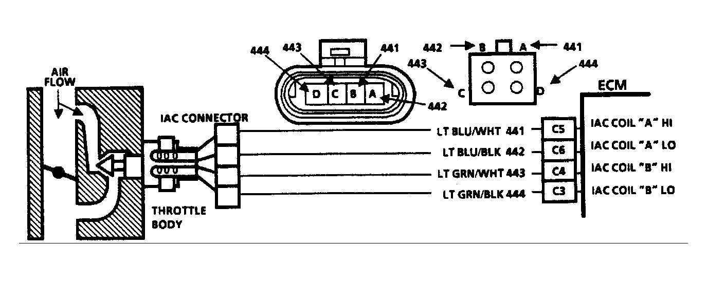 Check resistance between IAC terminals "B" to "C" and "A" to "D". Resistance should be infinite. If resistance is not as specified, replace IAC valve.