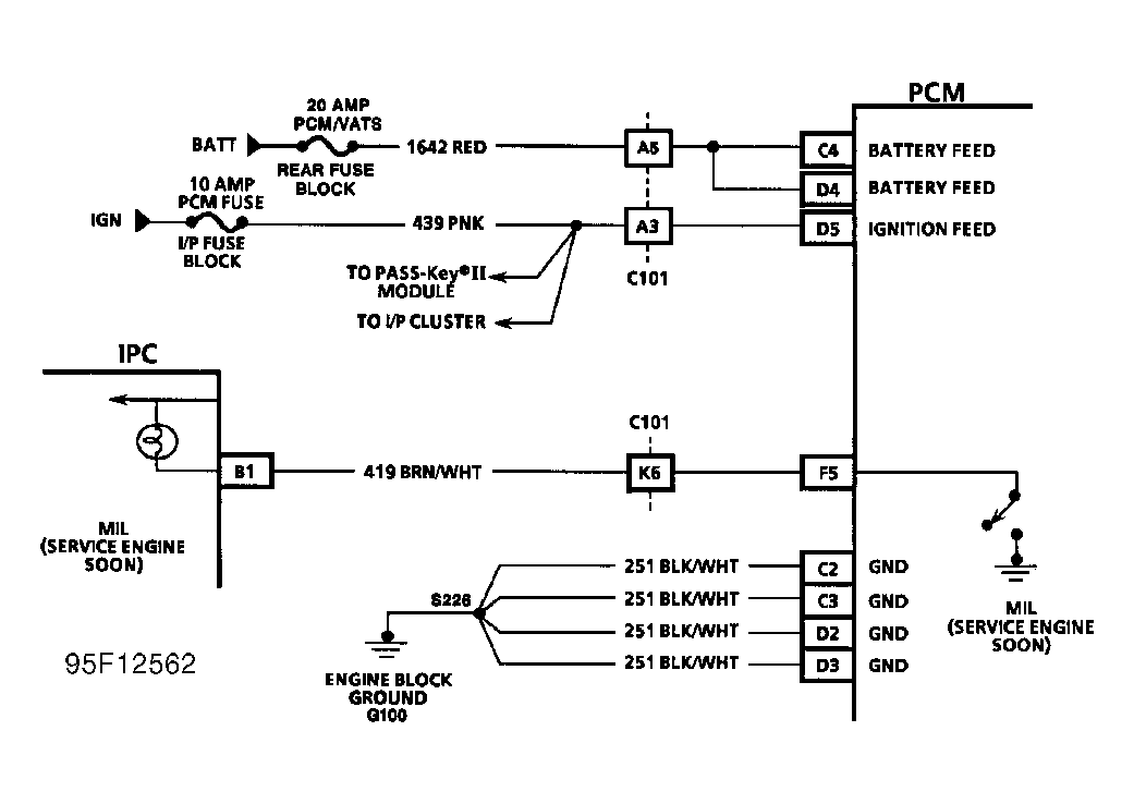 - Check 20-amp PCM/VATS fuse. If fuse is blown, check and repair short to ground in Red wire between PCM and fuse block. If fuse is okay, check and repair open in Red wire between PCM terminals C4 and D4, and fuse block. See Fig 1