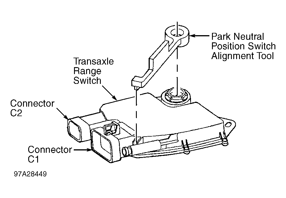 Remove negative battery cable. Remove shift linkage. Remove transaxle range switch electrical connector. Loosen transaxle range switch mounting blots. Place shift shaft in Neutral position and align flats of shift shaft with switch. Place Park Neutral Position Switch Alignment (J41545) tool and rotate switch until tool drops into position. See Fig 1. Tighten mounting bolts and remove alignment tool. After switch adjustment, verify that engine will only start in Park or Neutral. If engine will start in any other position re-adjust switch.