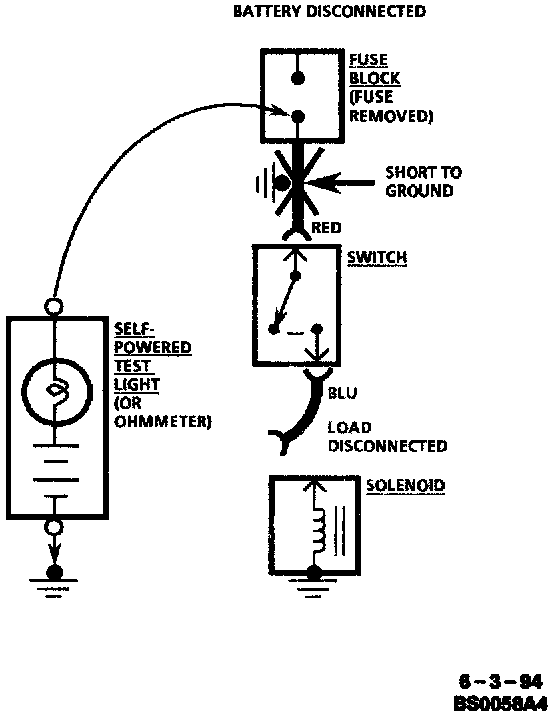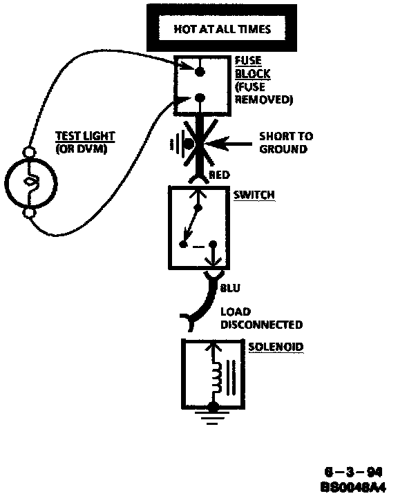 ^ If the fuse blows, the short is in the wiring leading to the first connector or switch. Use a test light or meter as described.