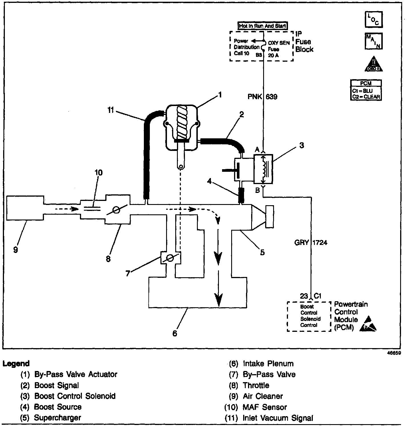 Under most conditions, the PCM commands the boost control solenoid to operate at a 100% duty cycle (ON) to allow full boost pressure upon demand. However, if reverse gear is selected or the PCM detects rapid deceleration or engine load is extremely high, reduced boost pressure is desired. Under these conditions, the PCM commands the boost control solenoid to operate at a 0% duty cycle (OFF), which opens the bypass valve. With the Bypass valve open, boost pressure is reduced by recirculating intake air back through the supercharger inlet.