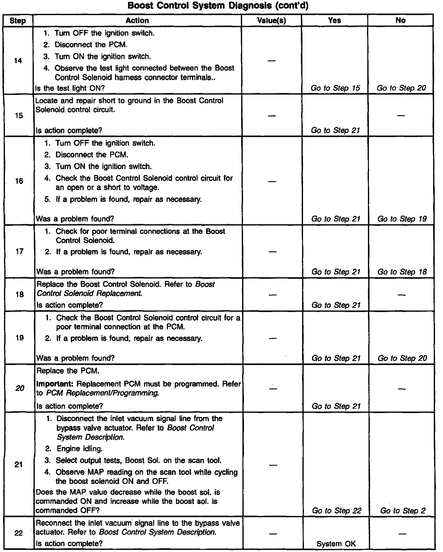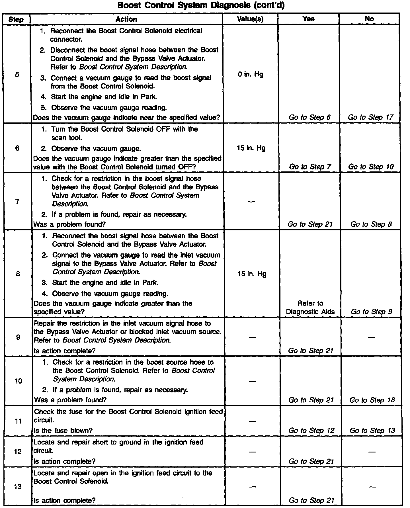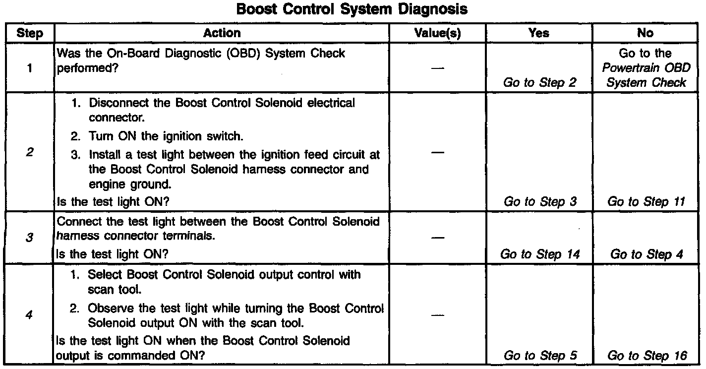 If the Boost Control System Check has been performed and no electrical or vacuum related fault is noted, check for the following conditions: