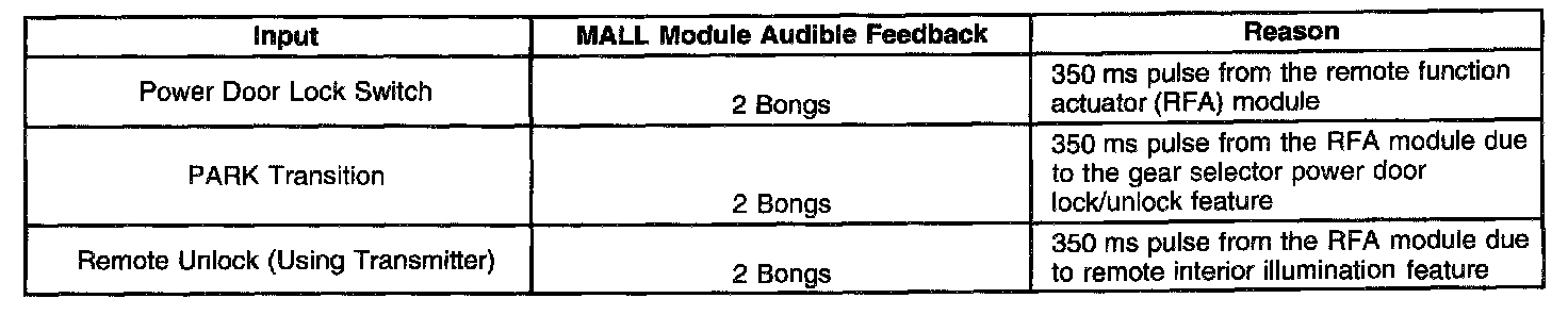 The MALL module electrical schematic differs between vehicles that have keyless entry and vehicles without keyless entry. For vehicles that are equipped with keyless entry, the audible feedback is different when activating any of the following items: