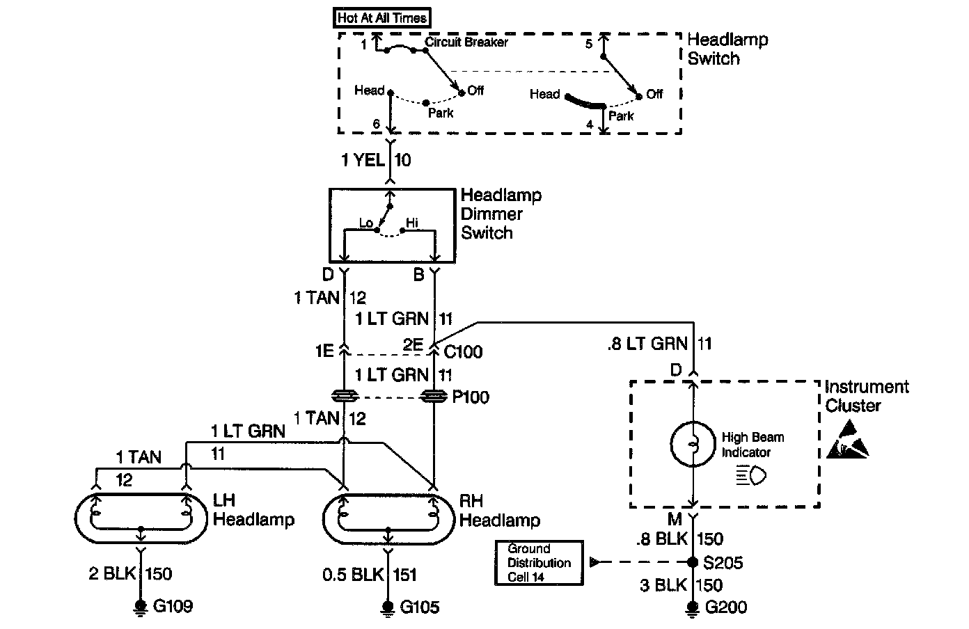 At this point analyze and (diagnose the problem), and develop text. Since the high beam indicator illuminated when the headlamp dimmer switch was in the high position, the high contacts of the headlamp dimmer switch and the LT GRN wire between the headlamp dimmer switch and C100 are good.