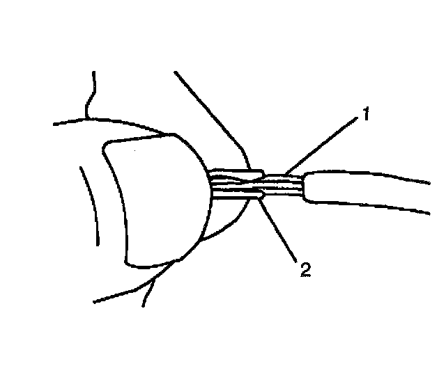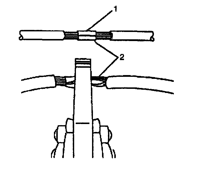 7. Center the splice clip (2) over the stripped wires (1) and hold the clip in place.