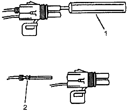 ^ Insert the Weather Pack(R) terminal removal tool into the front (mating end) of the connector cavity until it rests on the cavity shoulder (1).