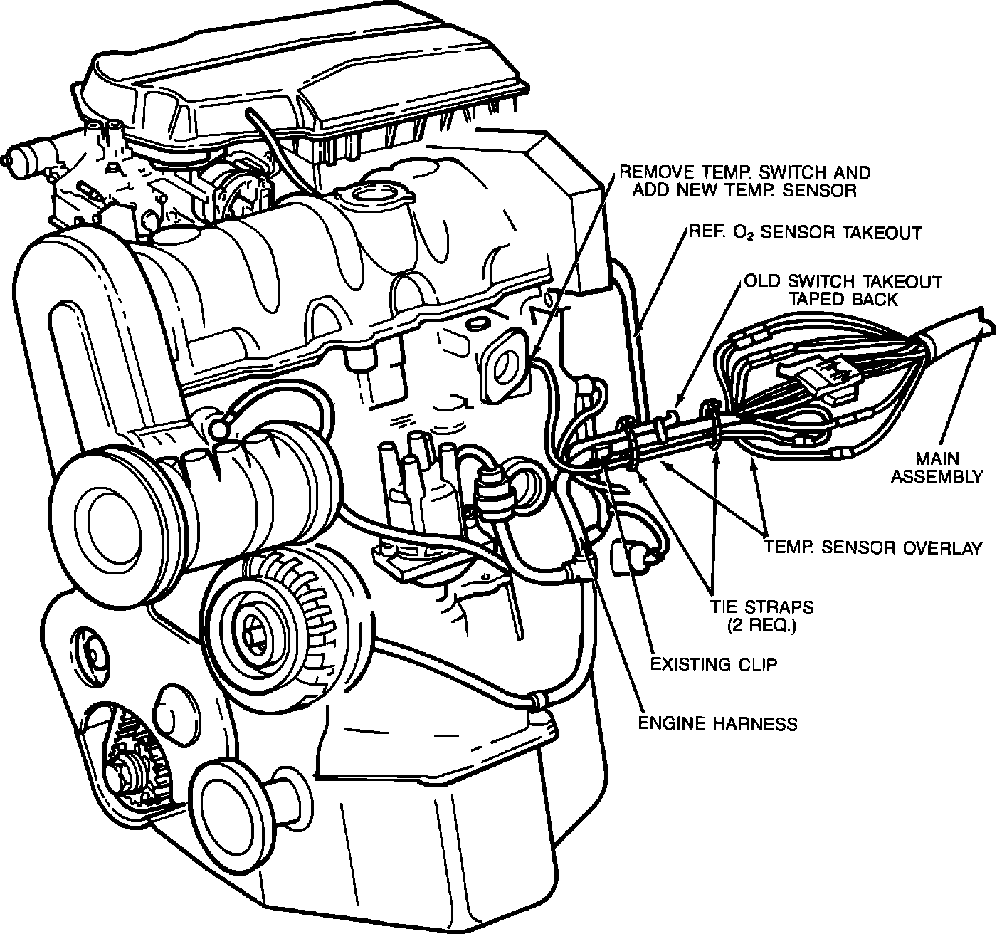 13. Secure engine coolant temperature sensor takeout from overlay harness to the existing engine harness using two tie straps as described below: